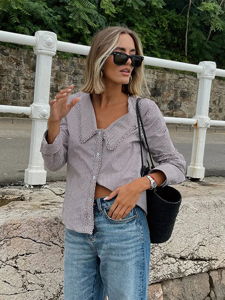 Lattice Turn-down Collar Women's Blouses Casual Single-Breasted Shirts For Woman Autumn Long Sleeved Fashionable Stretwears
