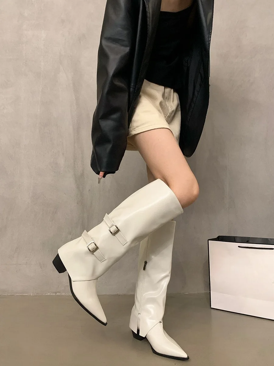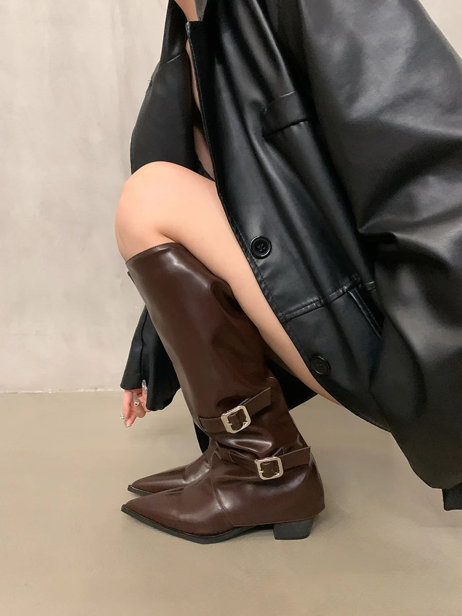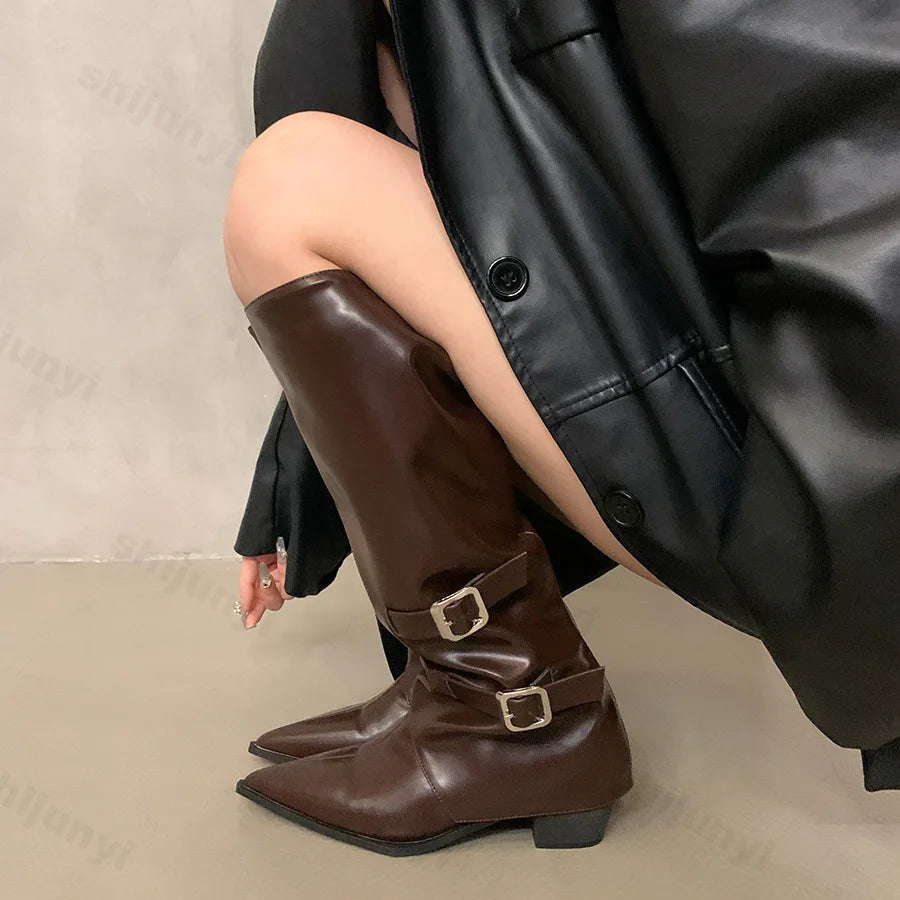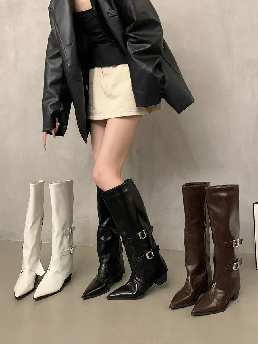 Lunivop Retro Style Women Knee High Boots New 2025 Fashion Belt Buckle Shoe Autumn Winter Wedges Heel Women Non-slip Knight Long Booties
