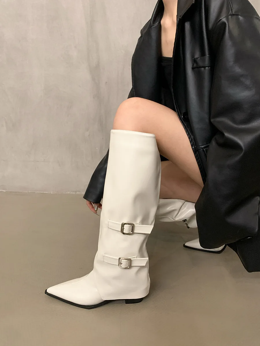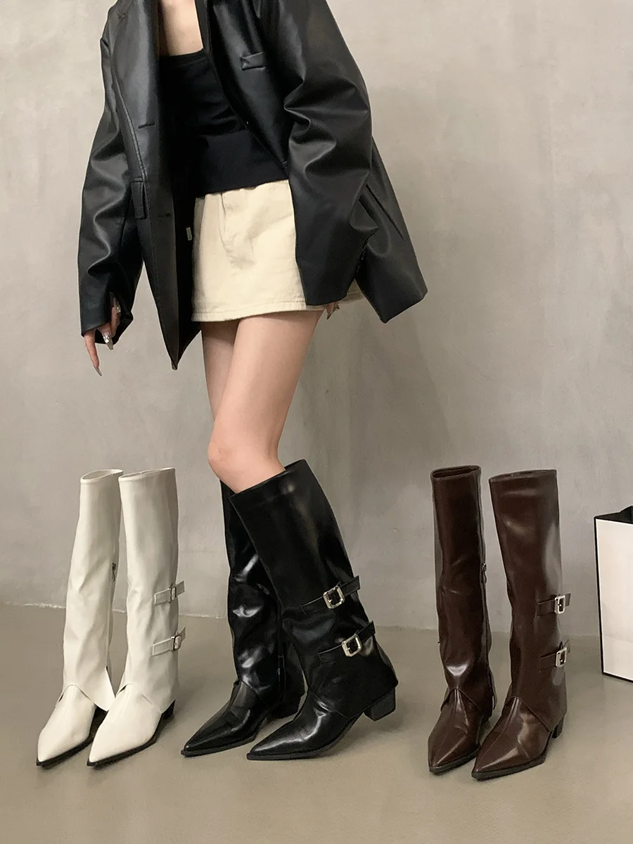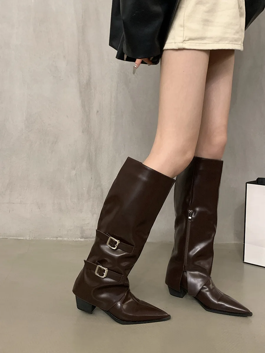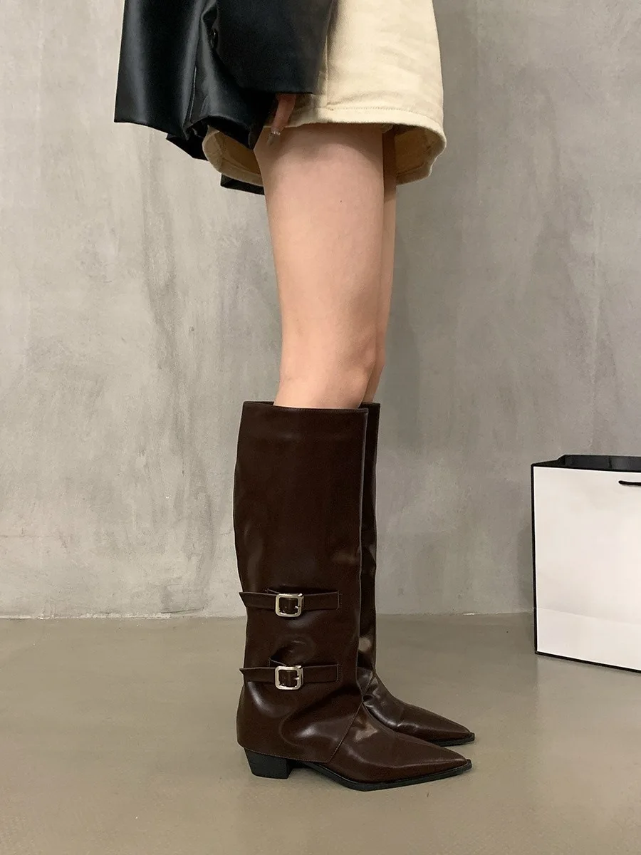 Lunivop Retro Style Women Knee High Boots New 2025 Fashion Belt Buckle Shoe Autumn Winter Wedges Heel Women Non-slip Knight Long Booties