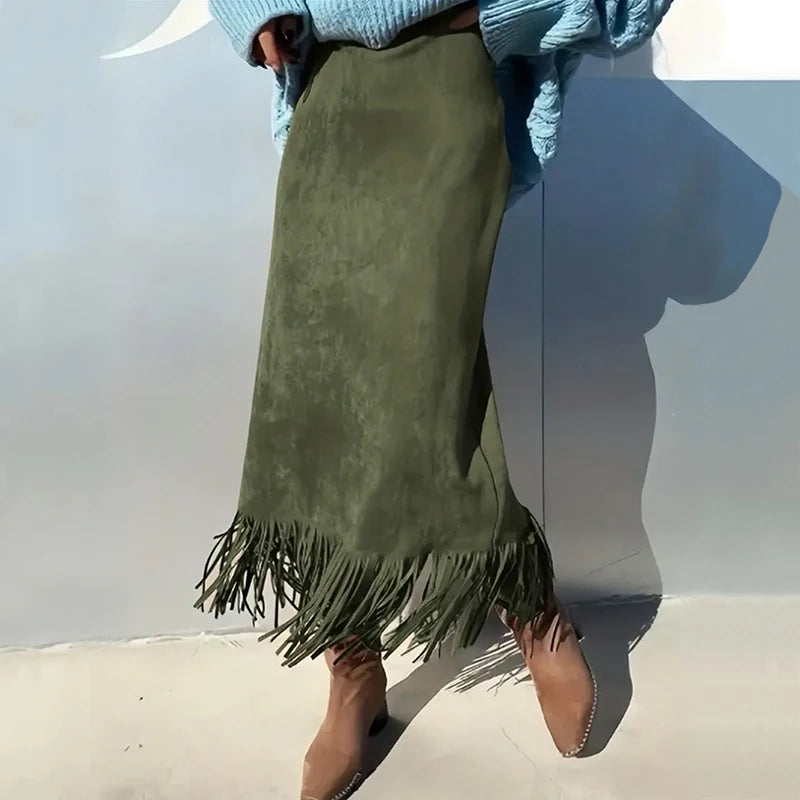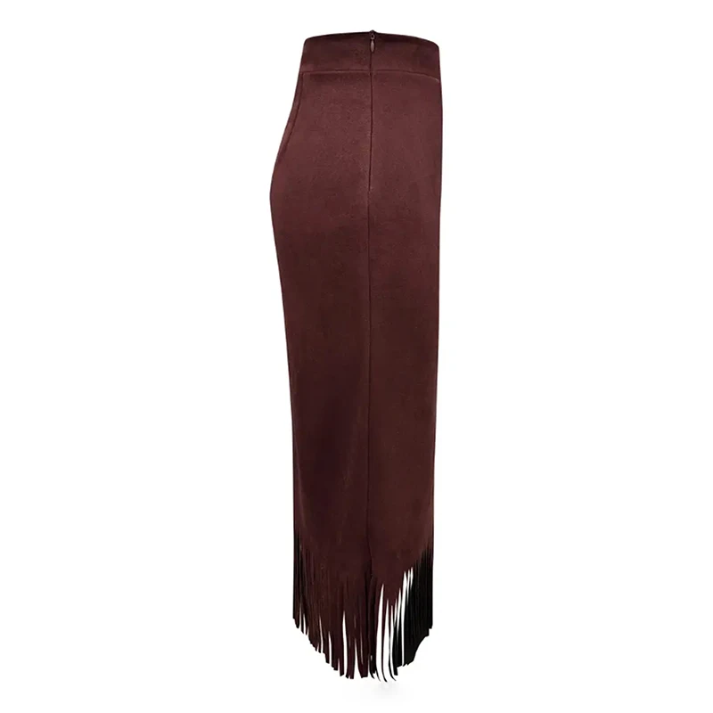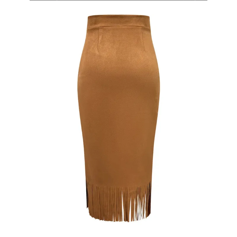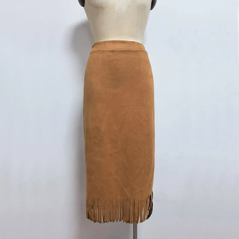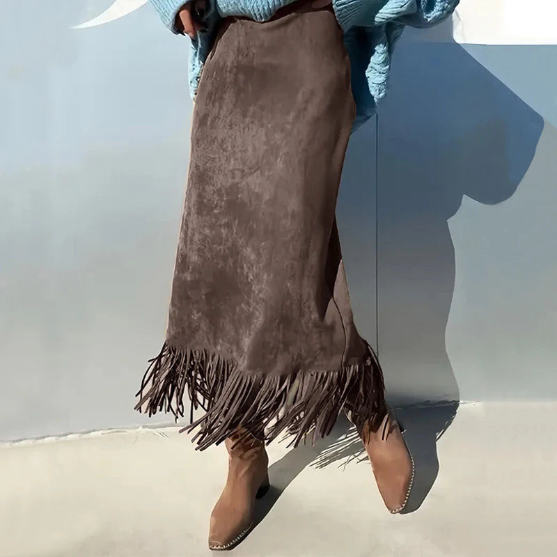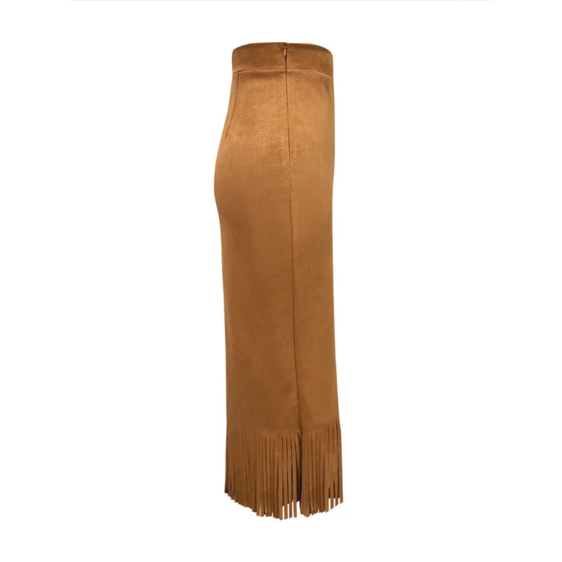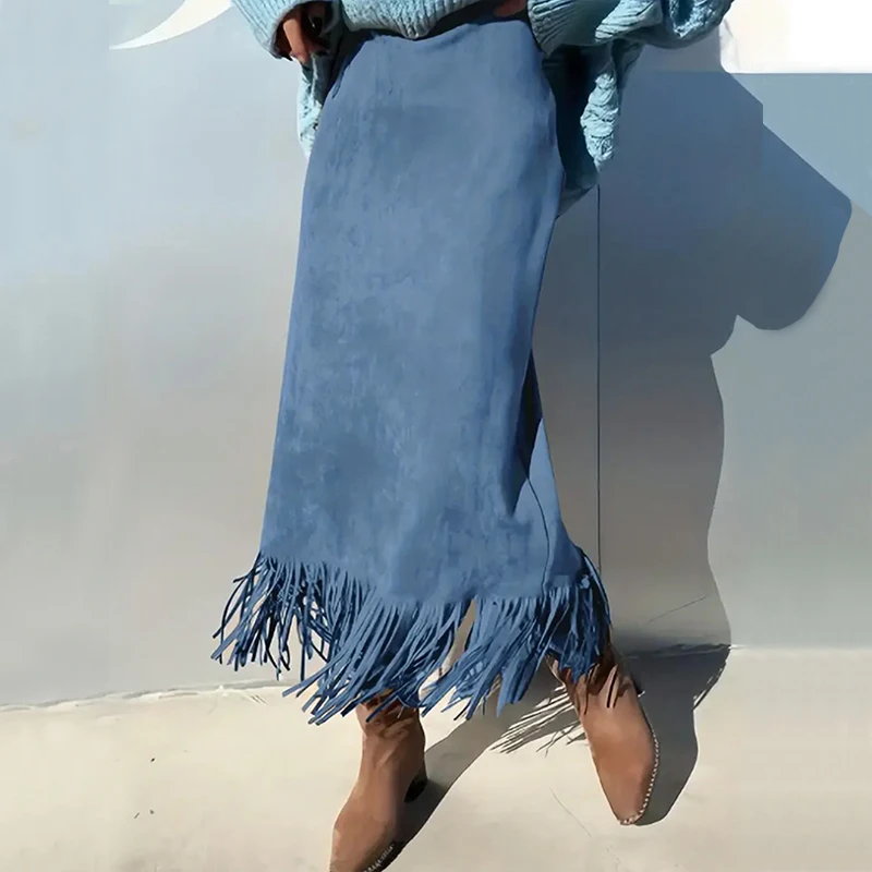 Lunivop Retro Women's Suede Midi Skirt Daily Casual High Waisted Solid Colors Tassel Hem Skirts Fashion Street Autumn Winter Chic Outfit