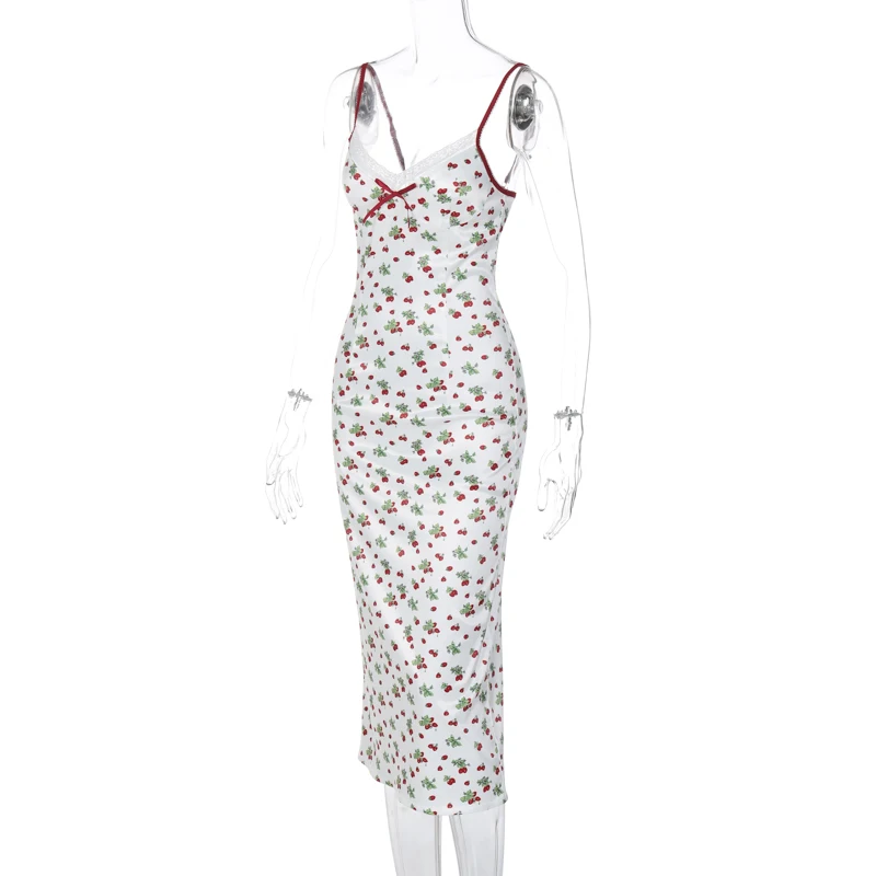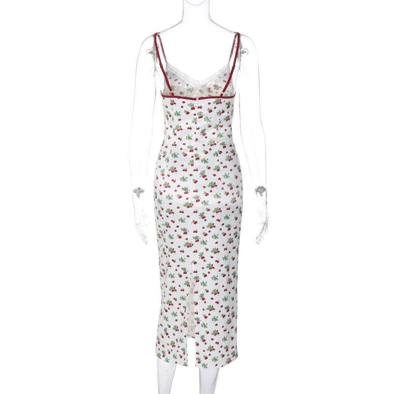 Lunivop Satin Strawbary Print Slit Lace Zipper Back Women'S Dresses Summer Autumn Party Prom Lady Casual Streetwear Clothing