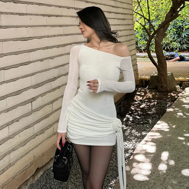 Lunivop See Through Floral Pattern Ruched Asymmetrical Long Sleeve Elegant Dress Y2K Streetwear Korean Casual Clothing