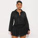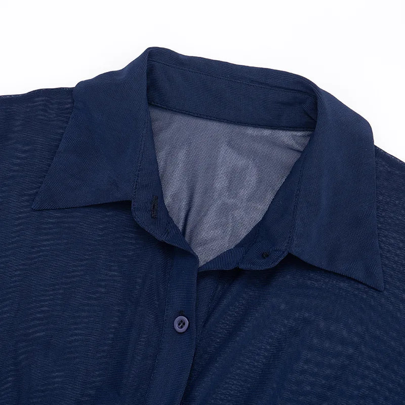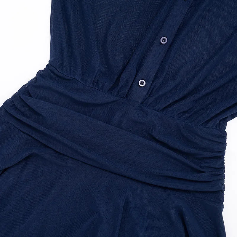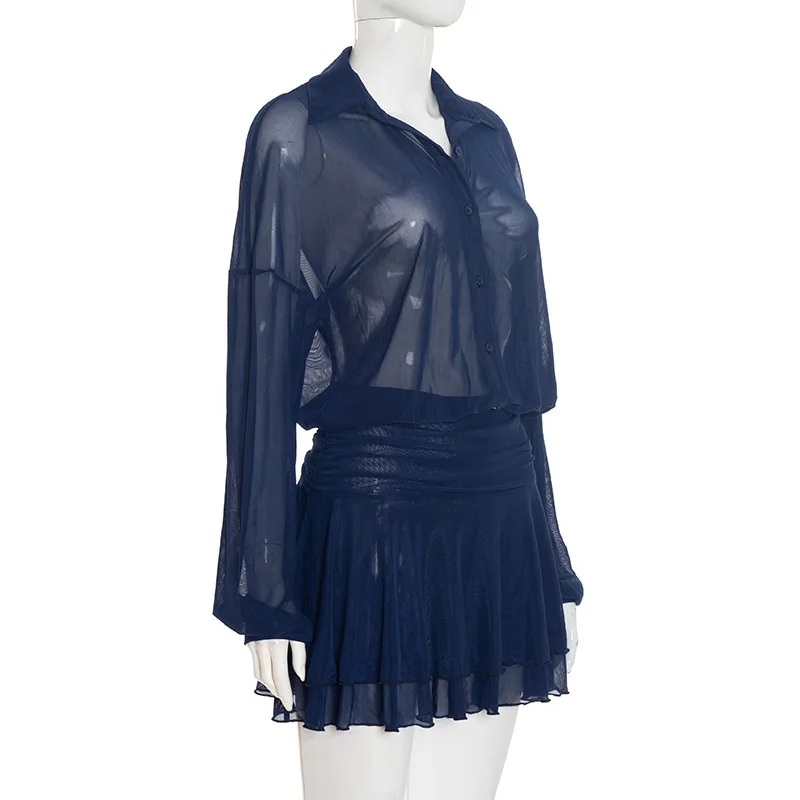 Lunivop See Through Mesh Ruffles Mini Dress Women Fashion Turn Down Collar Long Sleeve Single Breasted Shirt Ruched Casual Streetwear