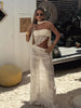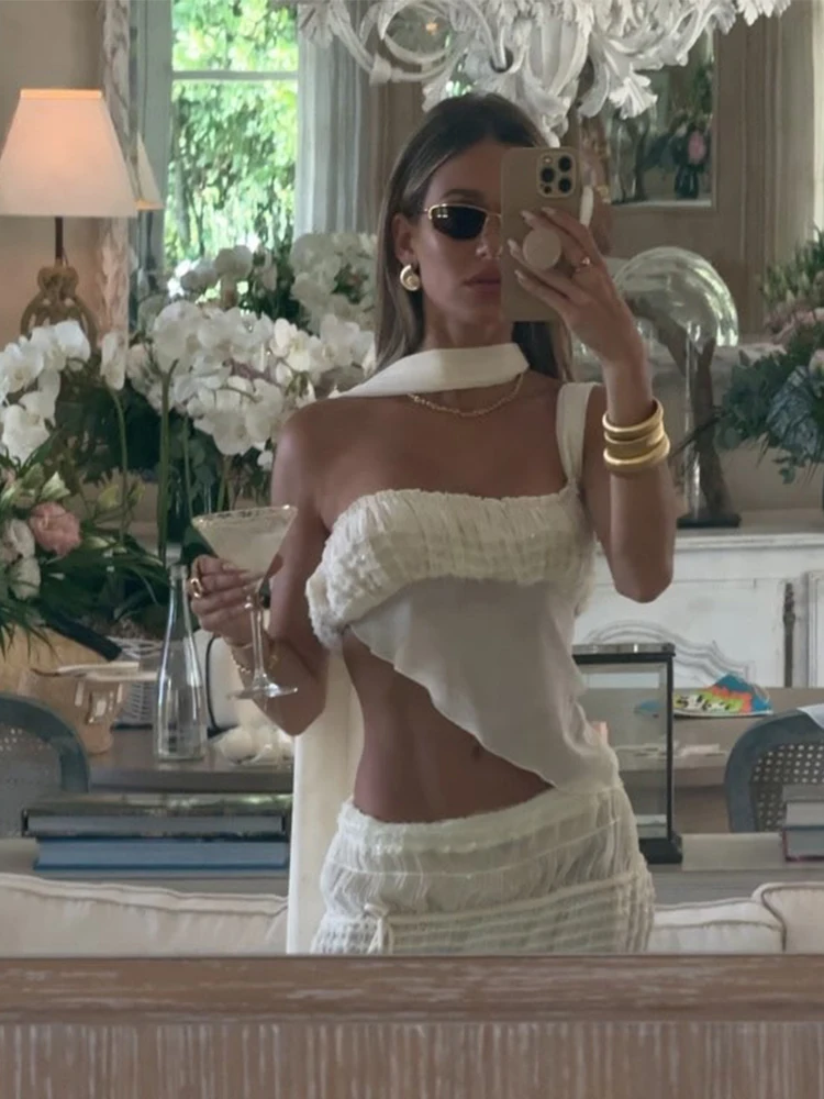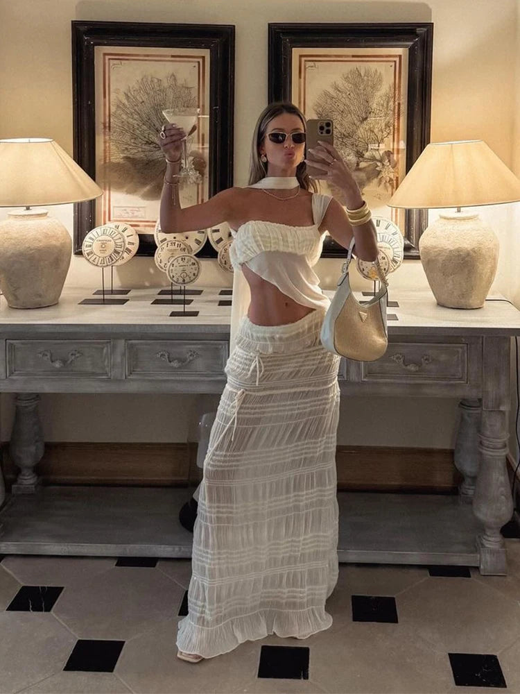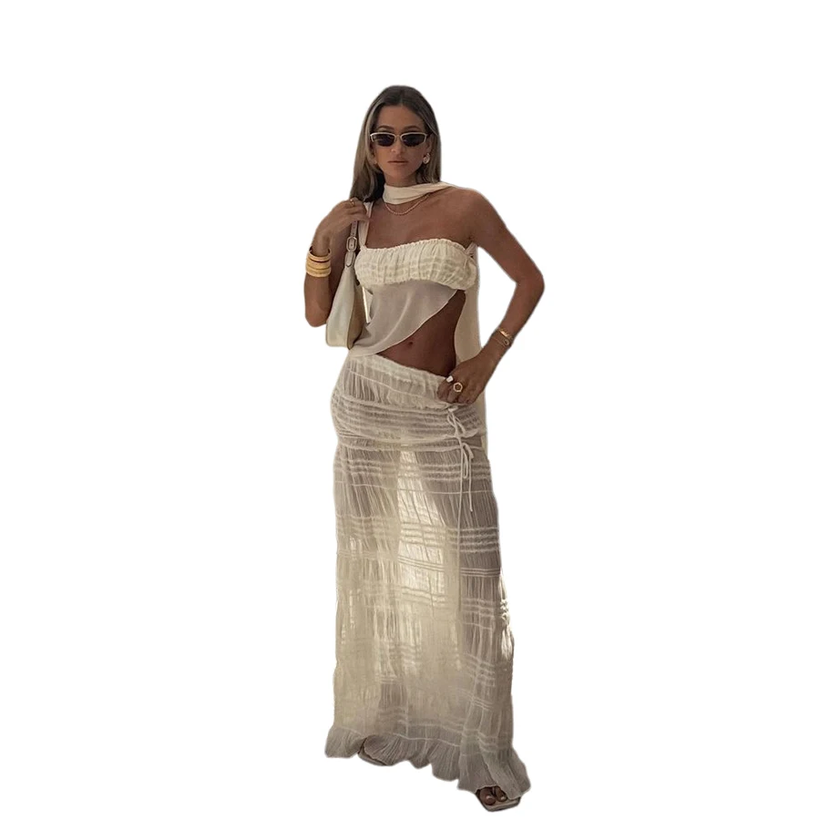 Lunivop See Through Two-Piece Set Scarf Mini Wrap Top Mesh Irregular Hem+Multi-Pleated Skirt Beach Party Matching Pretty Suits