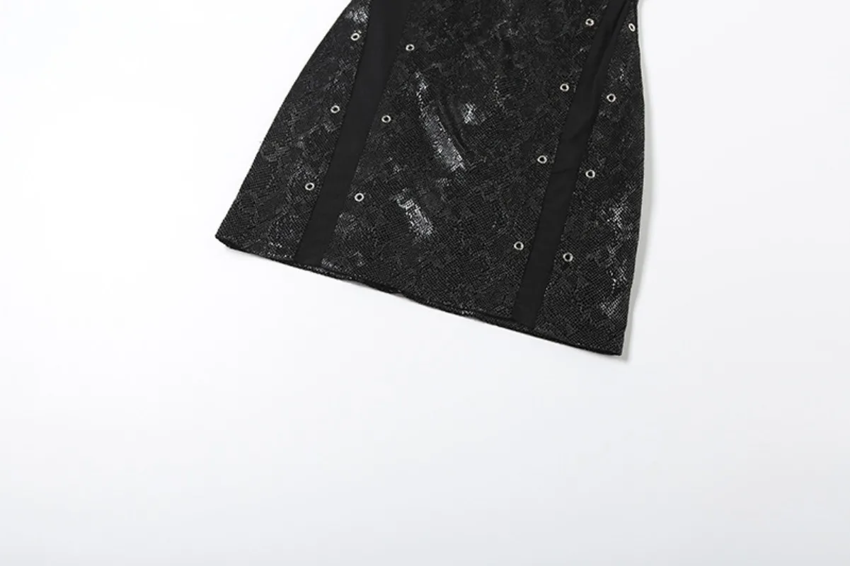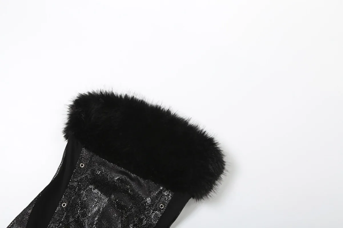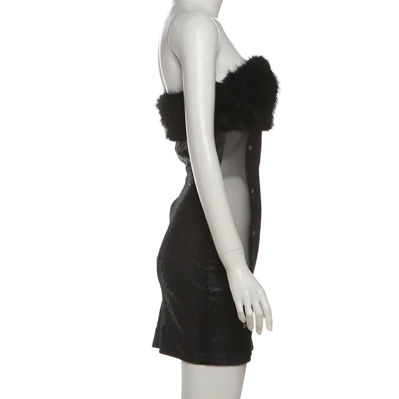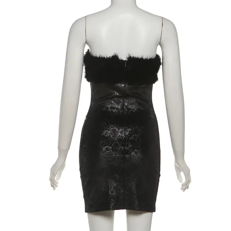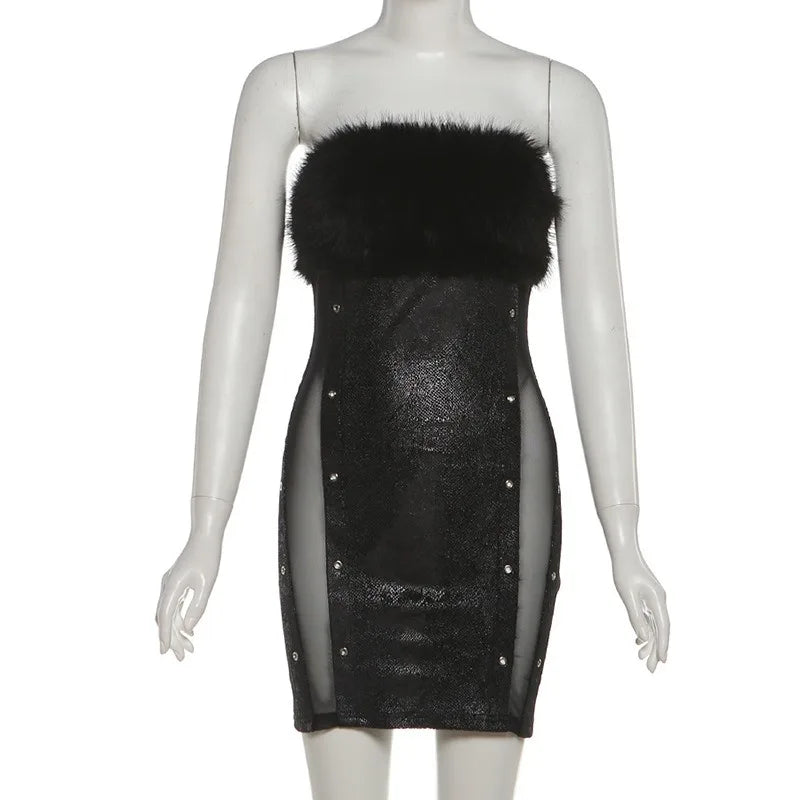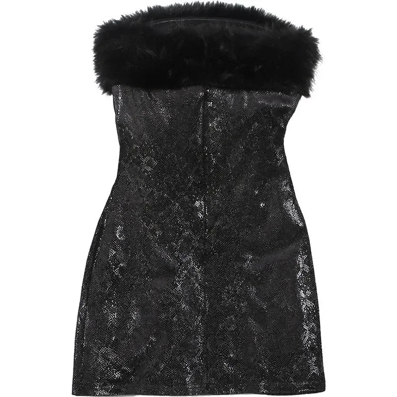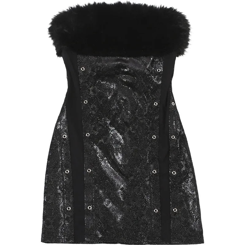 Lunivop Serpentine Print See Through Mesh Patwork Bodycon Mini Dress Women Fashion Sexy Faux Fur Strapless Hipster Party Night Clubwear