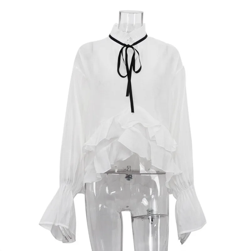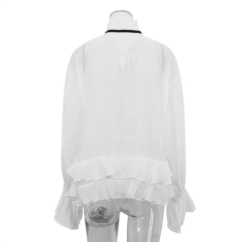 Lunivop Sexy See-Through White Shirt Female Lace Up Ruffled Collar Long Sleeve Blouse 2024 Autumn Fashion Elegant Women's Shirt