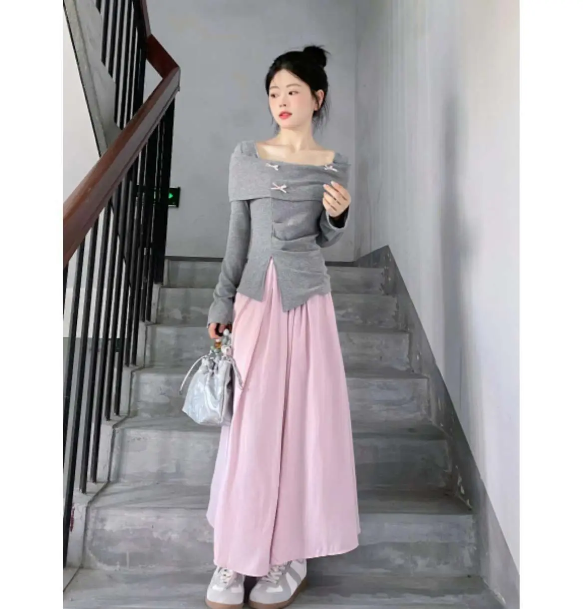 Lunivop Slash Neck Irregular Gray Long Sleeve Bow Camisetas Aesthetic Y2K Elegant Tees Slim Fit Women Knitted Tshirts Korean