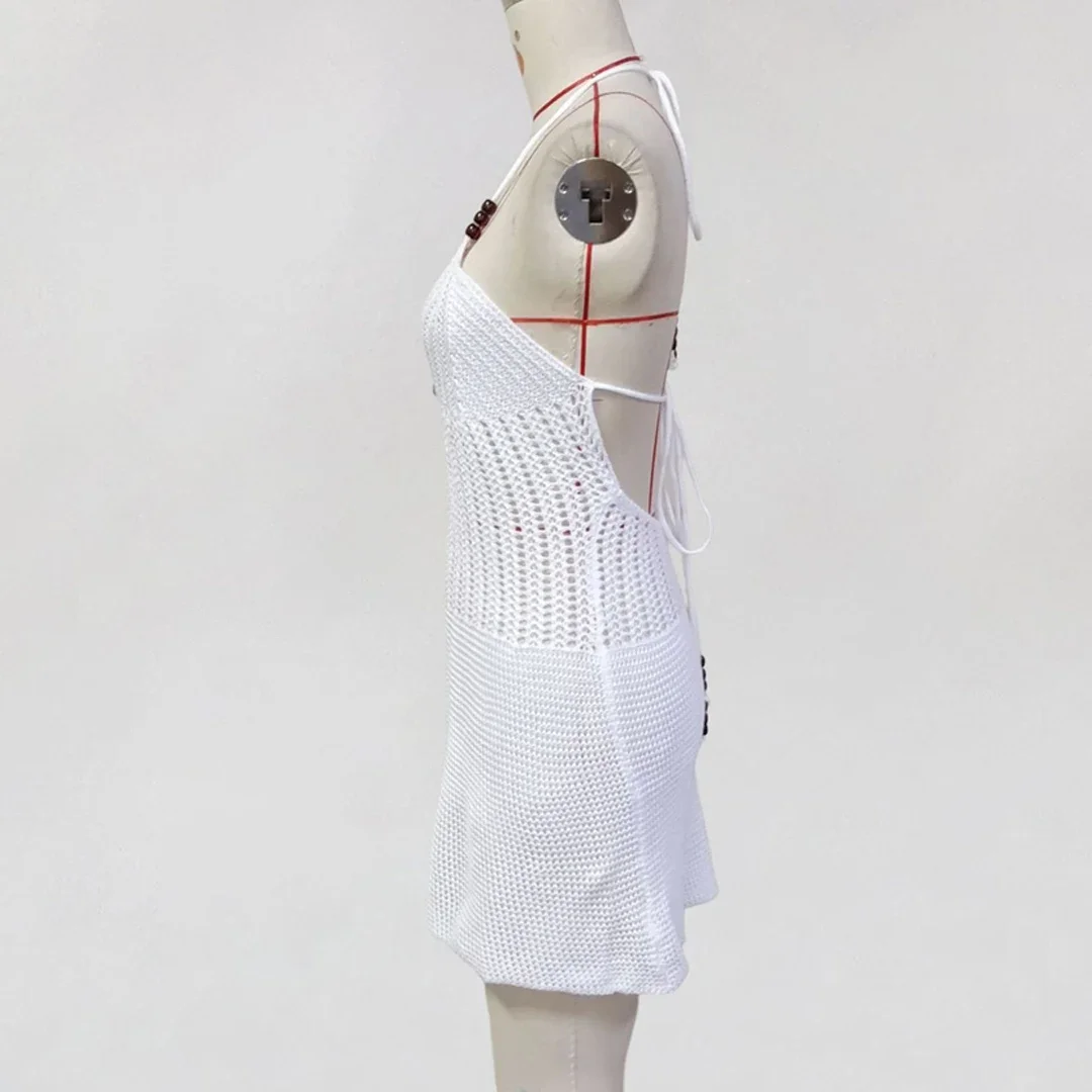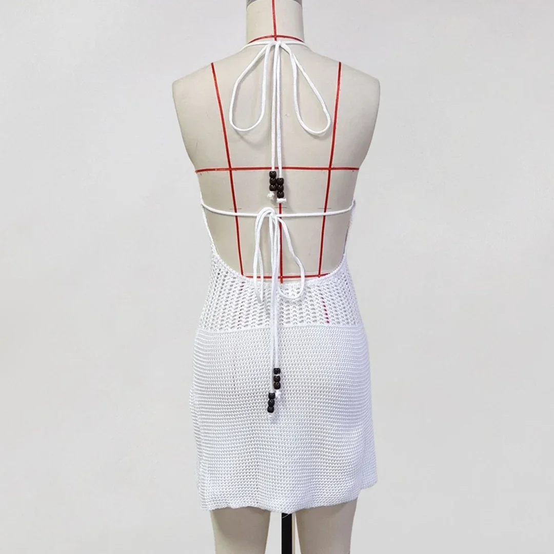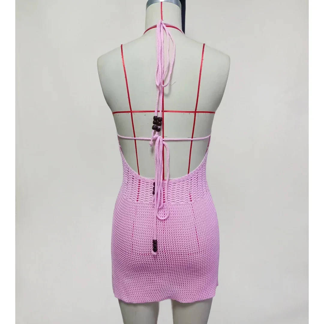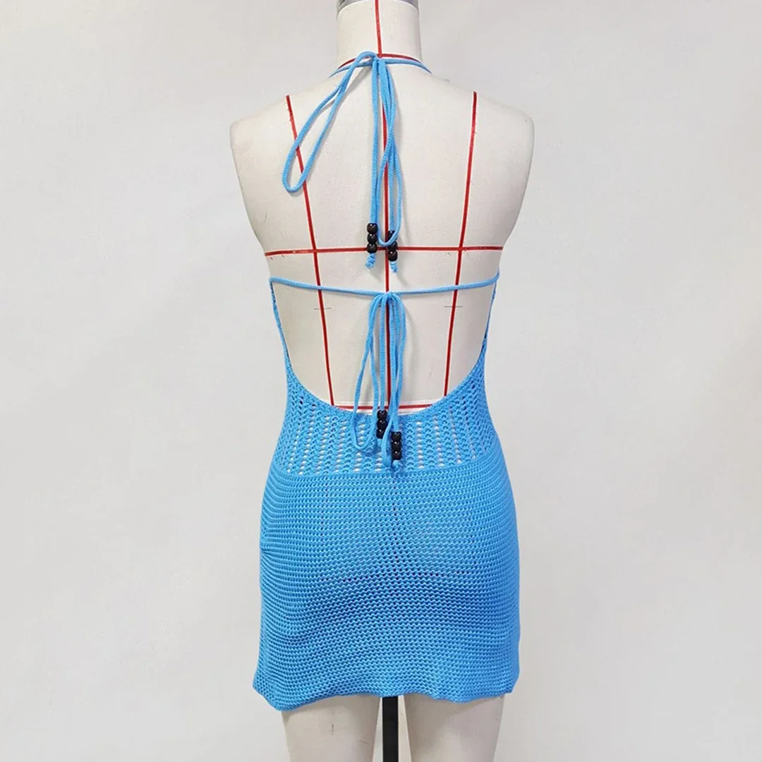 Lunivop Slim Bodycon Crochet Knitted Beach Dress Women Halter Mini Dress Summer Hollow Out V Neck Backless Sexy Party Dresses