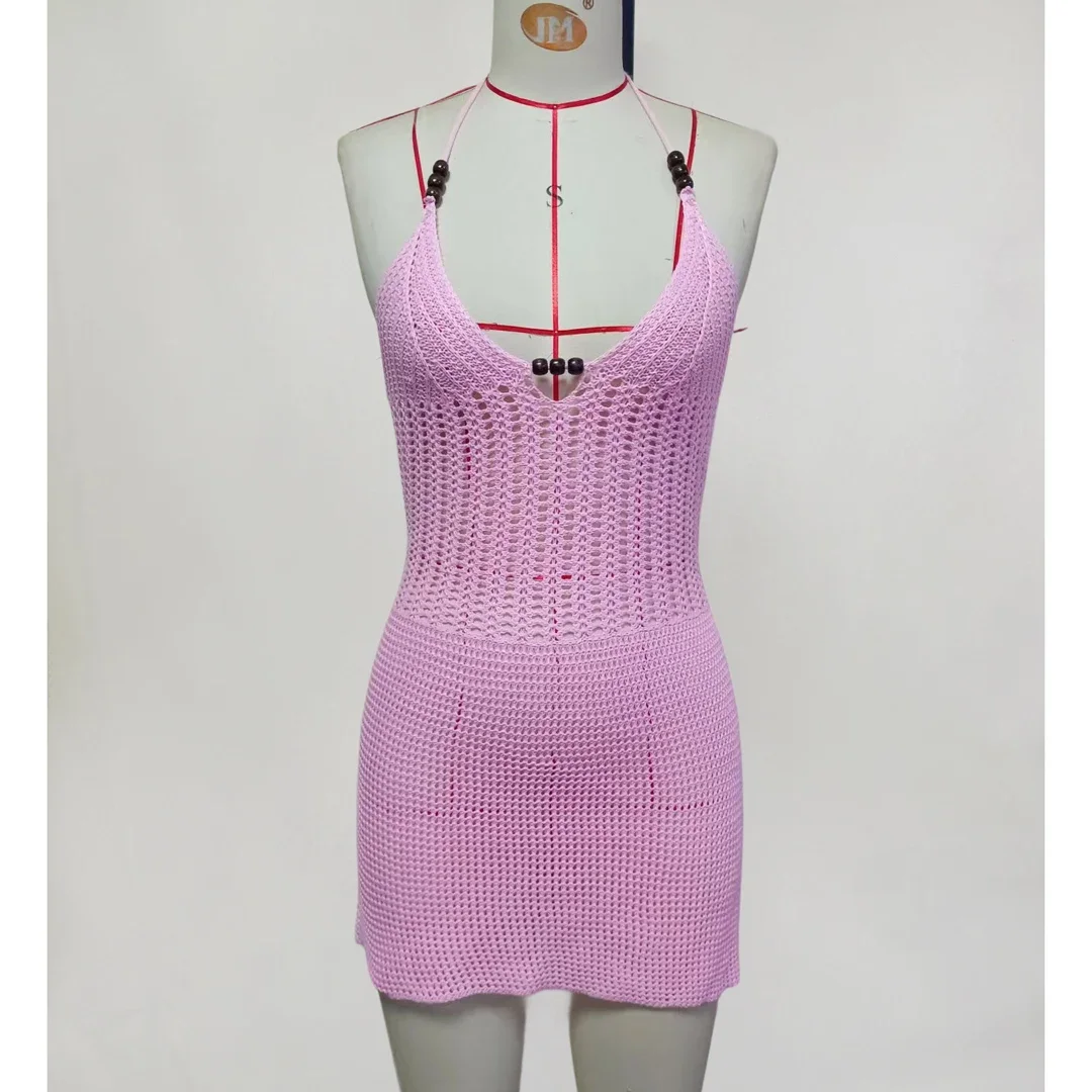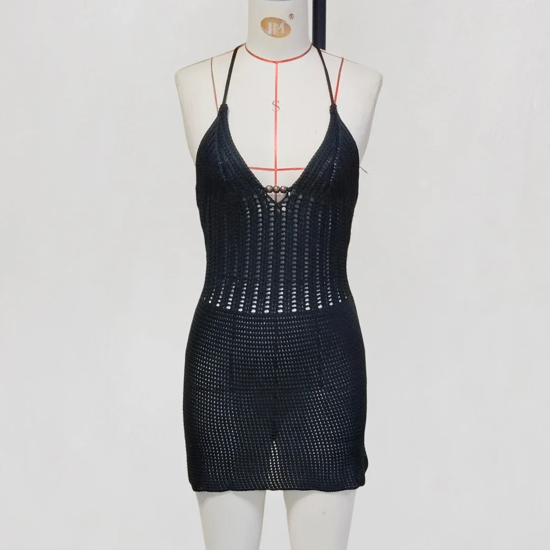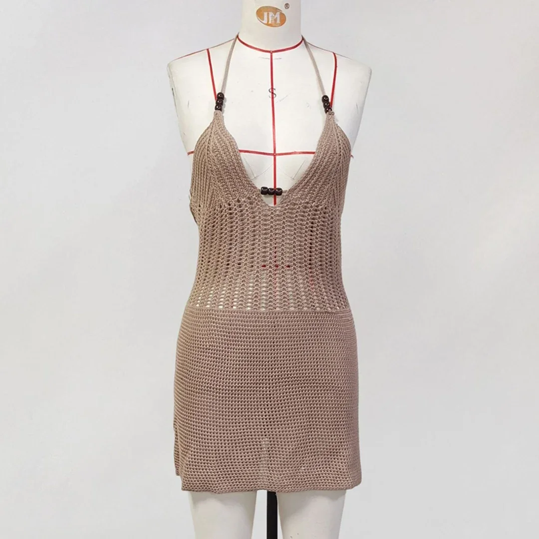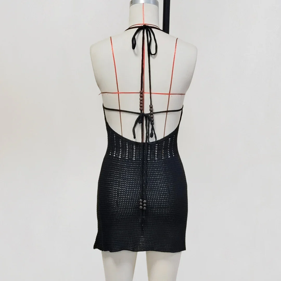 Lunivop Slim Bodycon Crochet Knitted Beach Dress Women Halter Mini Dress Summer Hollow Out V Neck Backless Sexy Party Dresses