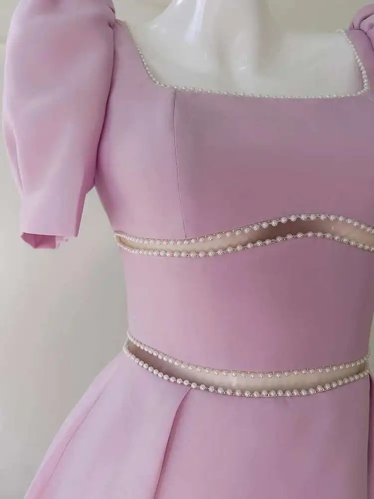 Lunivop Solid Hollow Beaded Design Long Dresses For Women Square Collar High Waist Elegant Dress Female 2025 New Clothing