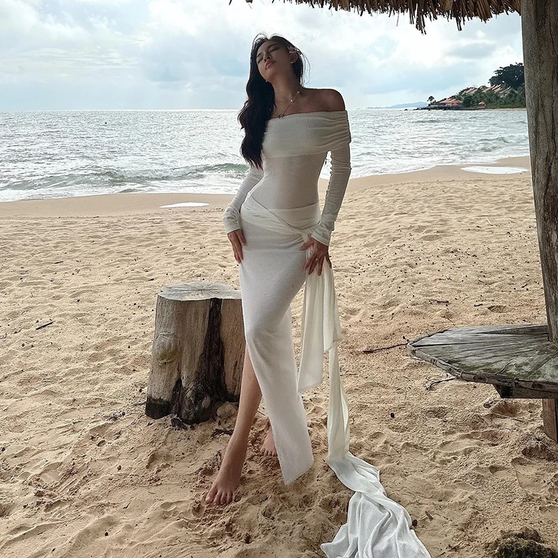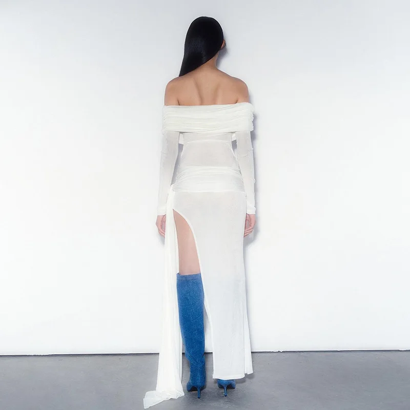 Lunivop Solid Off The Shoulder Long Sleeve Slit Ruched Tassel Women'S Dresses New Autumn Elegant Evening Fashion Clothing