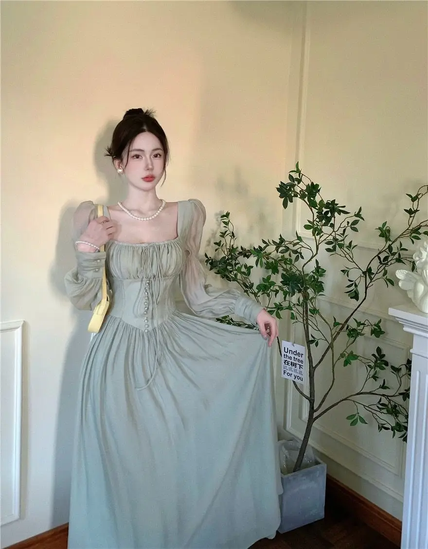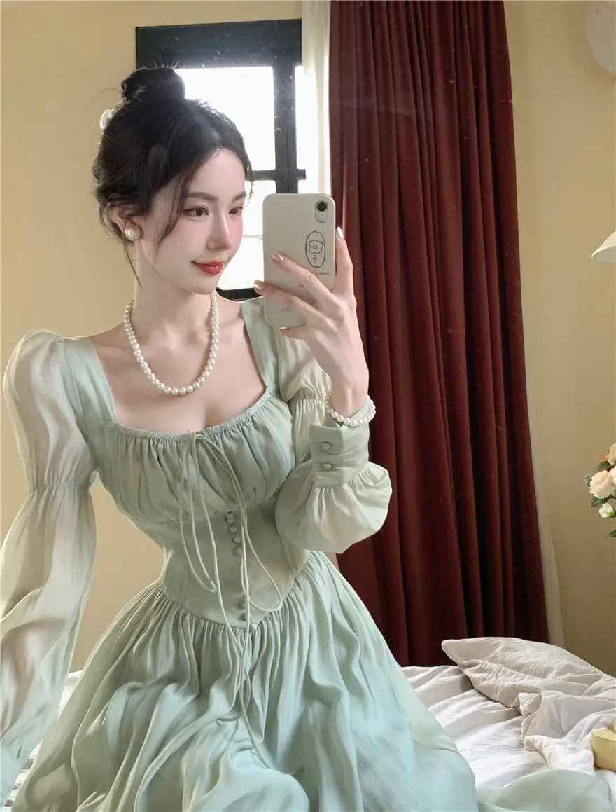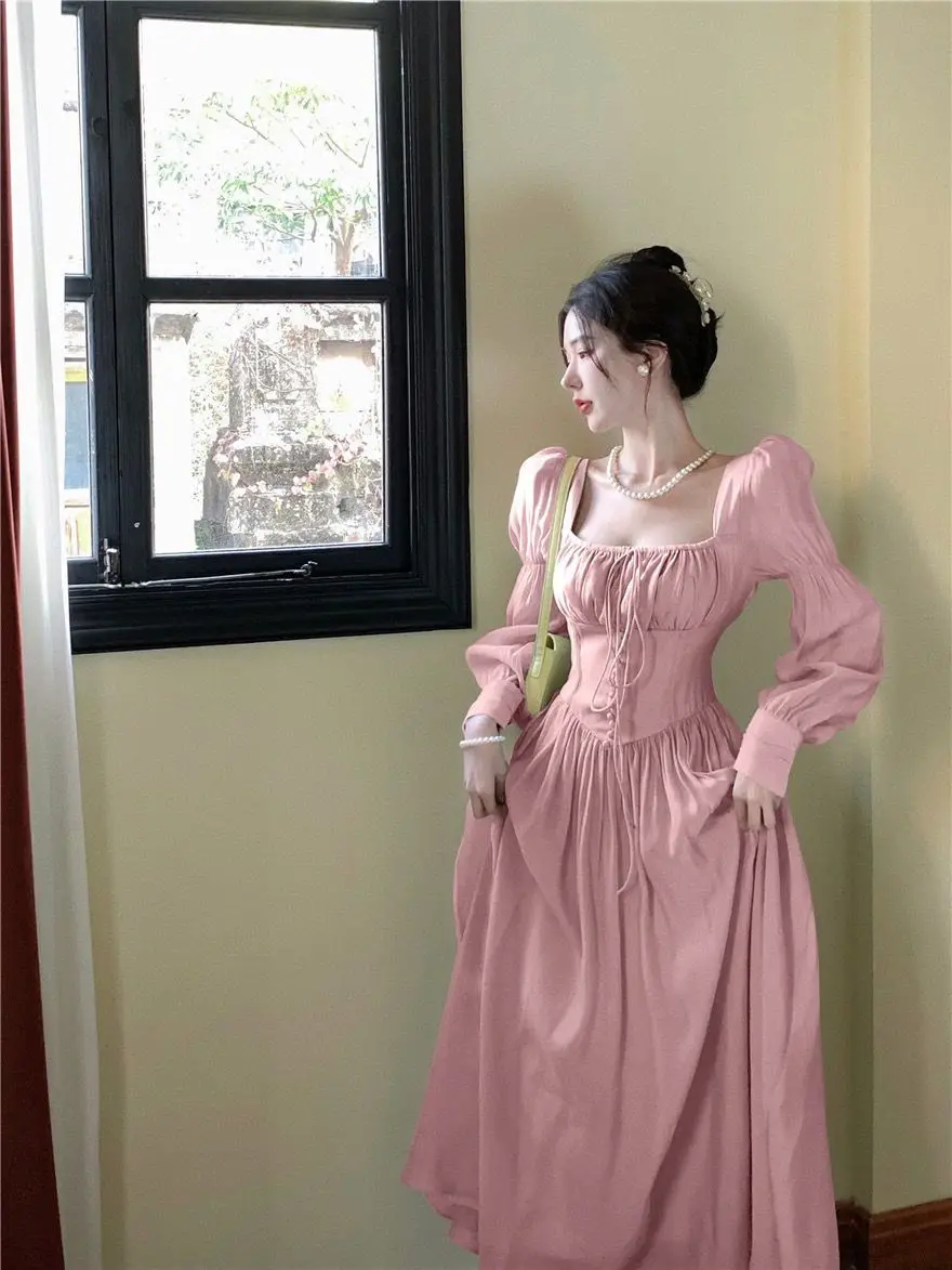 Square Collar Dresses Women: Pink Green Beige Long Puff Sleeves Dresses