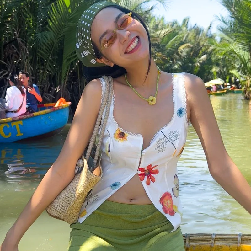 Lunivop Square Collar Print Sleeveless Lace Button Pear Slit High Waist Tank Crop Top Vacation Trip Casual Clothing