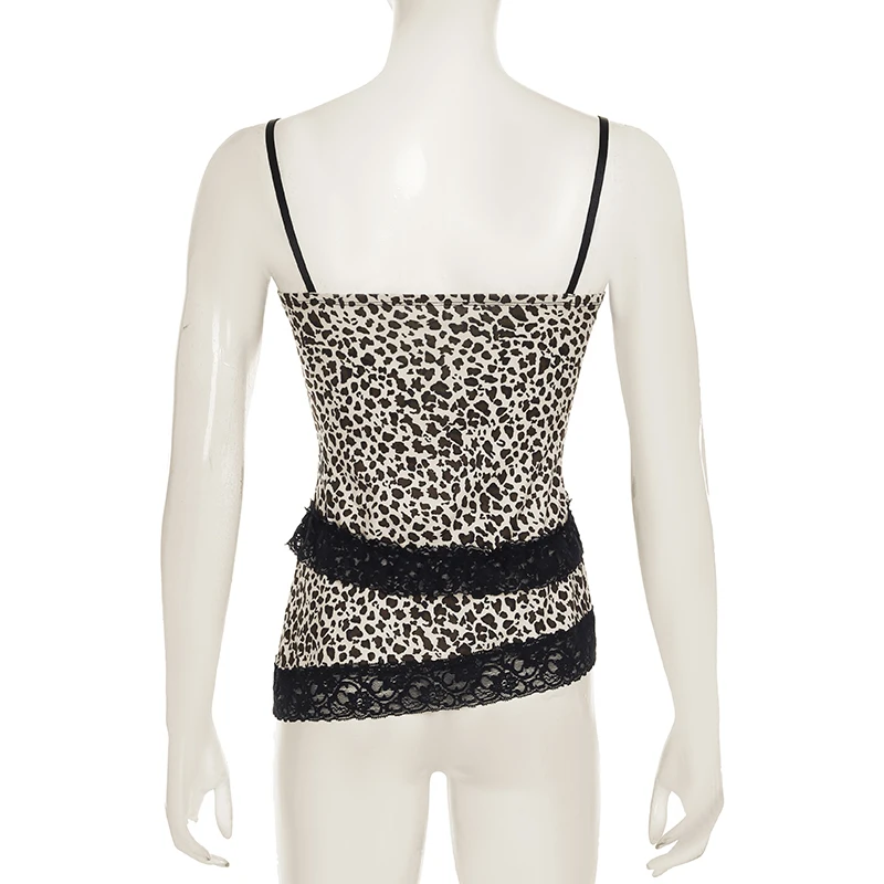 Lunivop Stitching Lace Camis y2k Vintage Leopard Print Crop Top Women Retro Sleeveless Bow Patchwork Tee Summer Asymmetrical Vest
