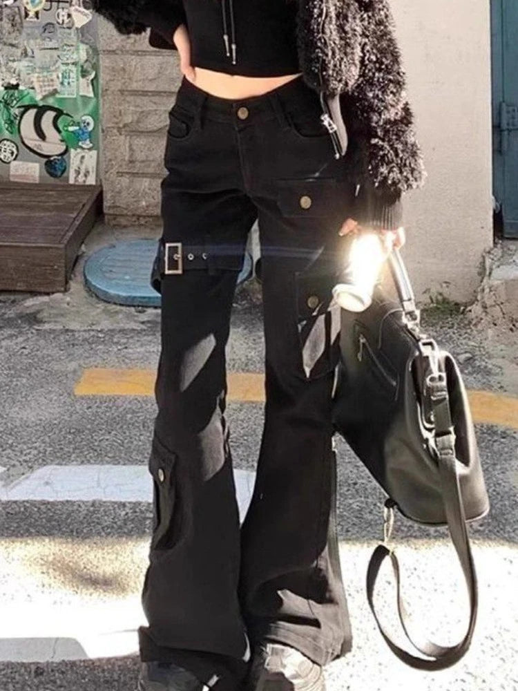 Lunivop Street Vintage Black Bell Bottom Jeans for Women 2025 Spring New Denim Pants Y2k High Waist Multiple Pockets Trousers