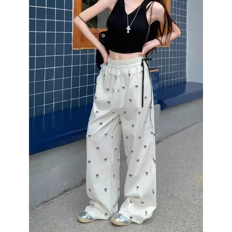 Lunivop Streetwear Bow Print Casual Straight Pants Women Summer New Korean High Waist Lace Up Contrast Color Patchwork Casual Pants
