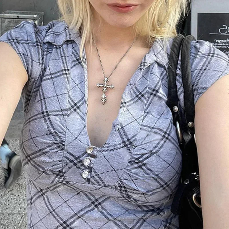 Lunivop Streetwear Contrast Color Striped Casual Short Sleeve T-Shirt Women Summer New V-Neck Button Sexy Slim All Match Crop Tops