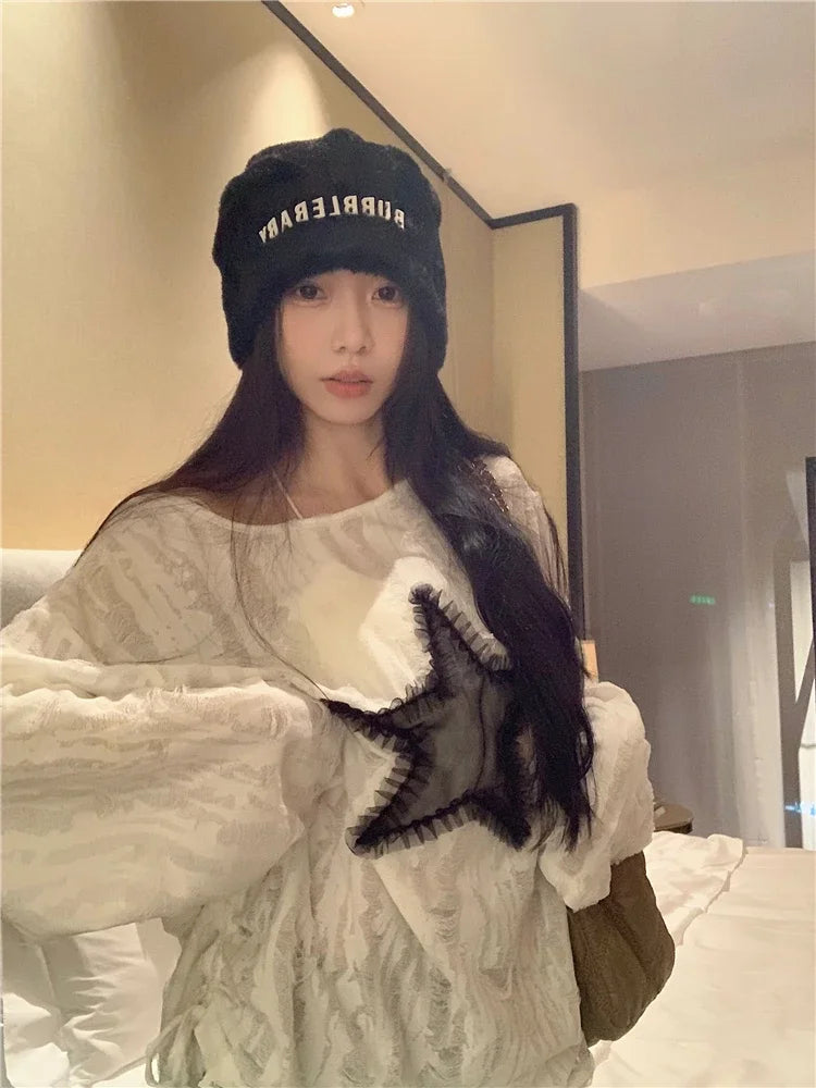 Lunivop Streetwear Drawstring Pleated Loose Long-sleeved T-shirt Women Autumn New O-Neck Star Stitching Distressed Casual Tops