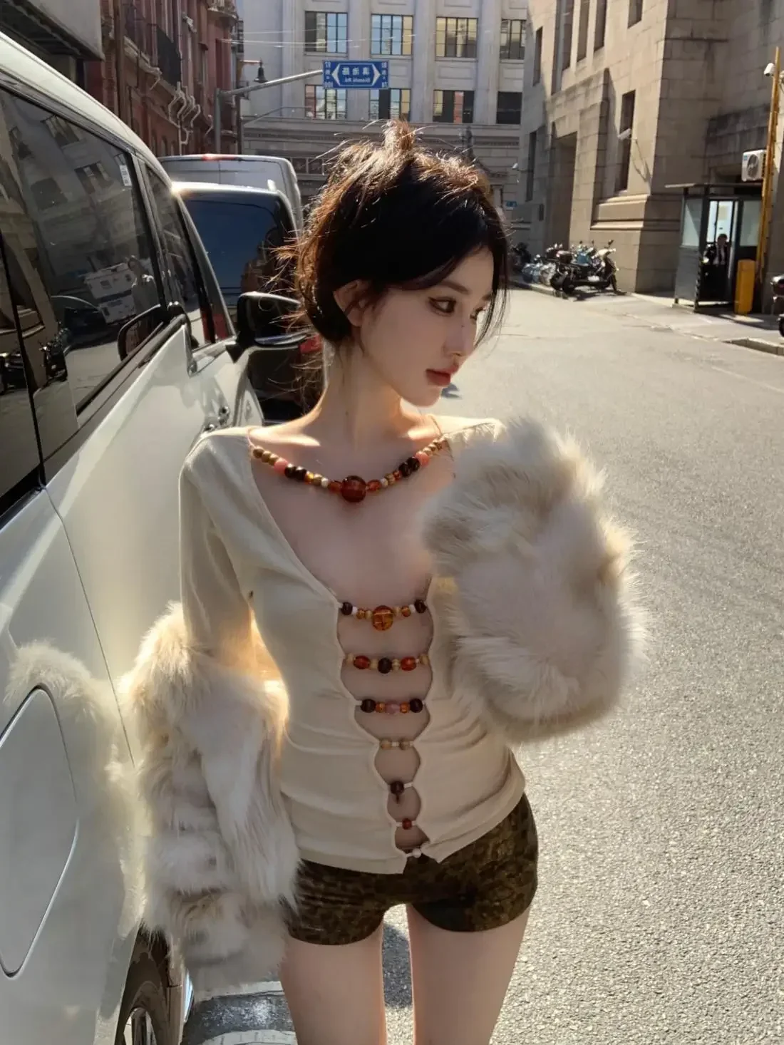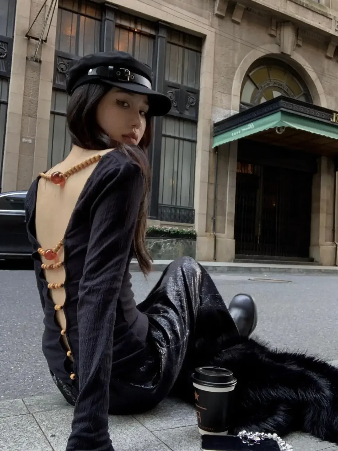 Lunivop Streetwear Y2k Aesthetic Causal T-Shirts Sexy Slim Hollow Out Beading Tshirts Harajuku Vintage Elegant Long Sleeve Bodycon Tees