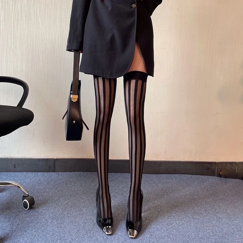 Lunivop Striped Black Silk Jacquard Long Stockings JK Uniform Thigh Socks Female Club Party Over the Knee Stockings Spring Summer