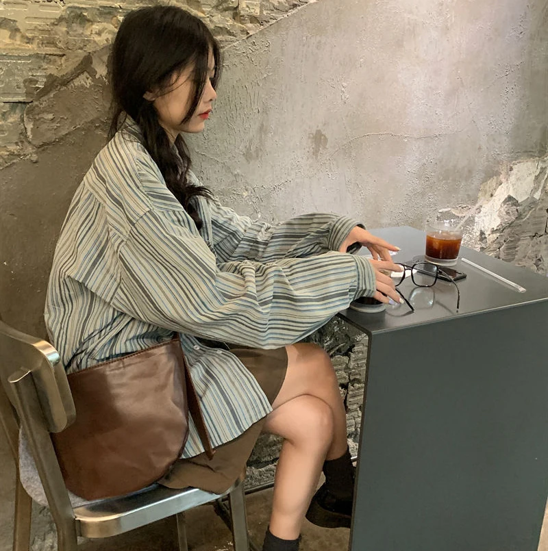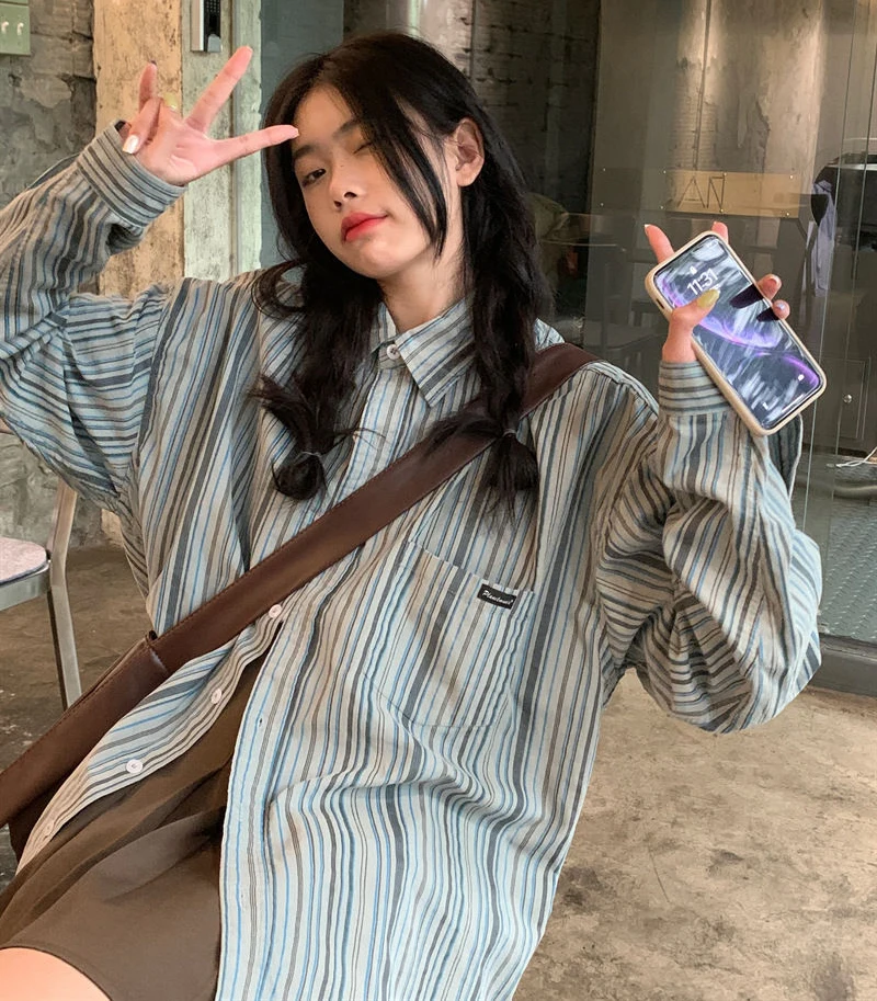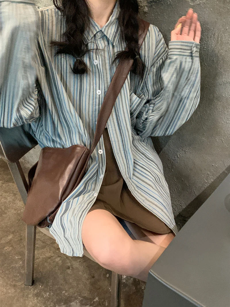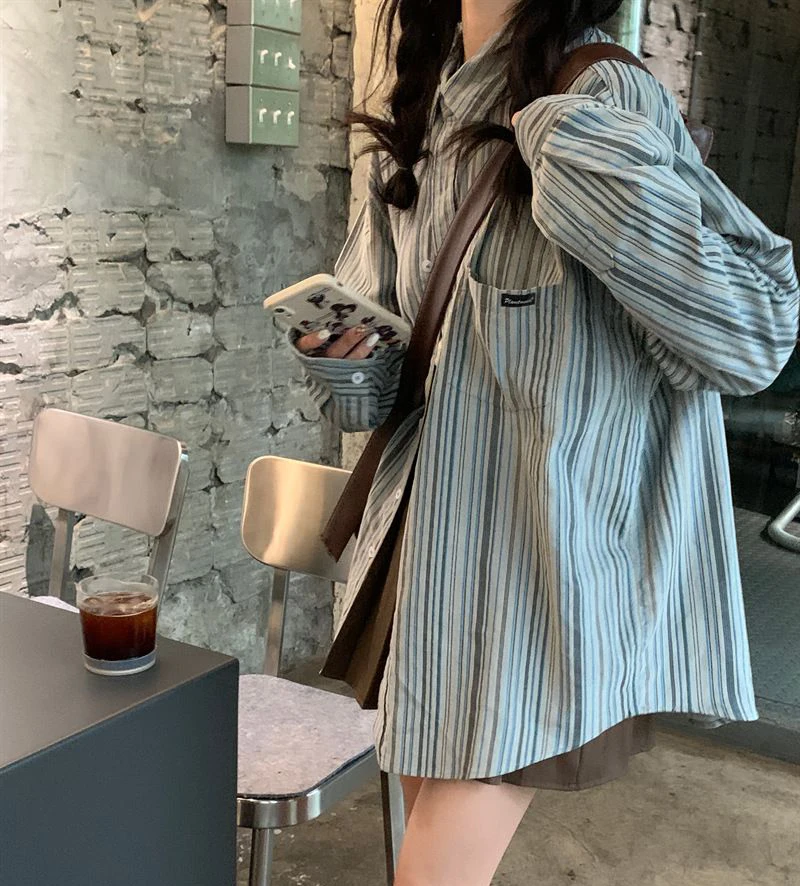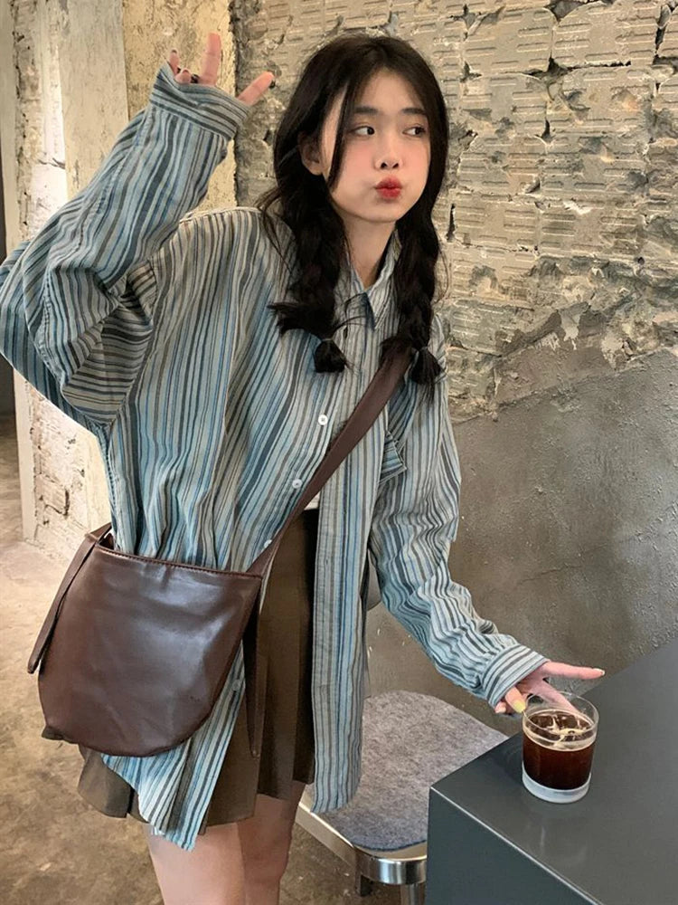 Lunivop Striped Loose Retro Shirts Women Casual Preppy Style Long Sleeve Blouse Vintage Female Pockets All Match Spring Korean Tops