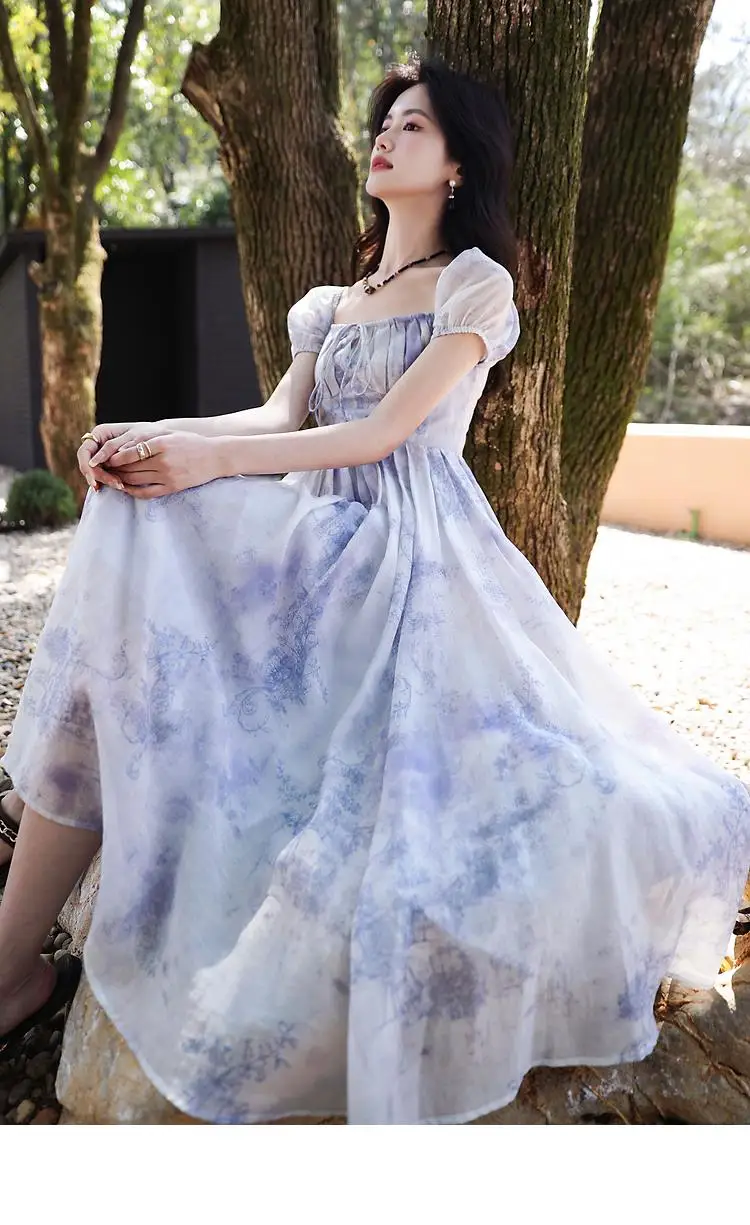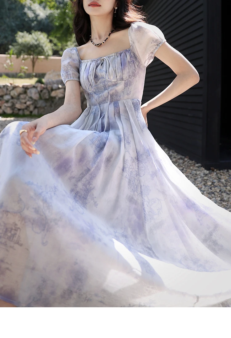 Lunivop Summer Fashion Print Short Sleeve Women Fairy Elagant Dress Vintage Holiday Purple Lace-up Birthday Evening Party Vestidos