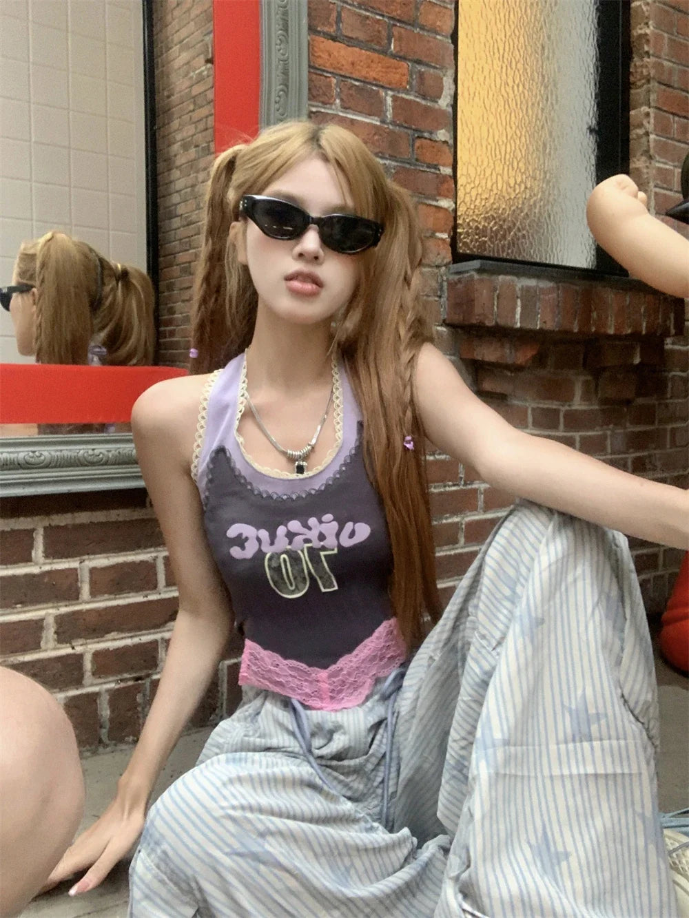 Lunivop Summer New Korean Letter Printed Lace Patchwork Sexy Camisole Women + High Waist Drawstring Striped Pants Two-piece Suit