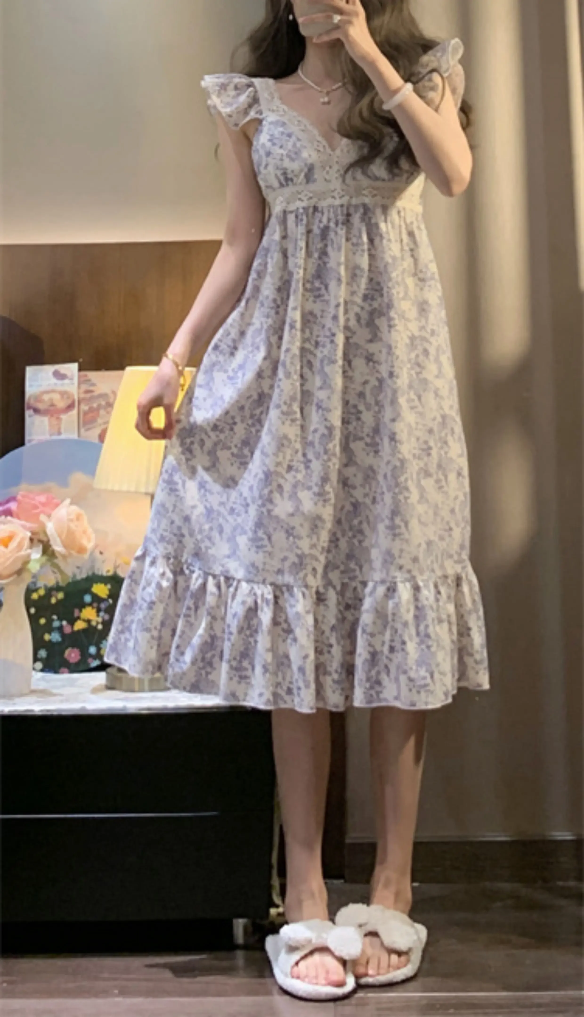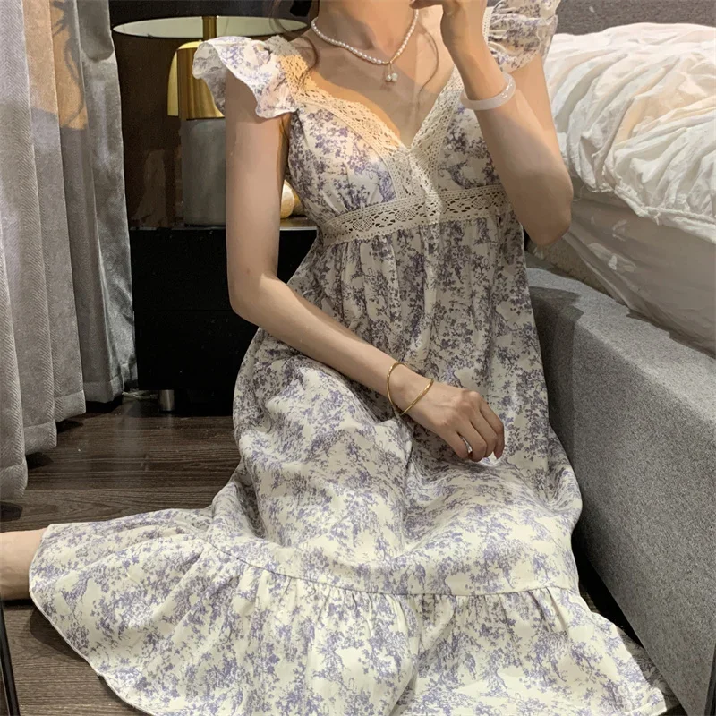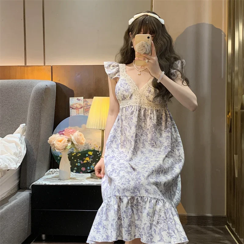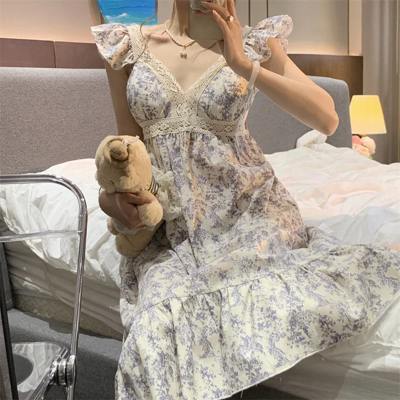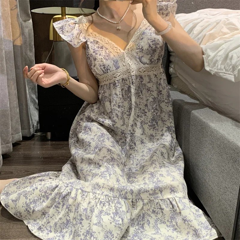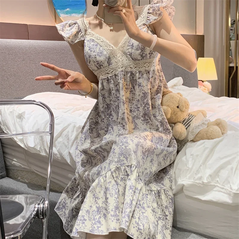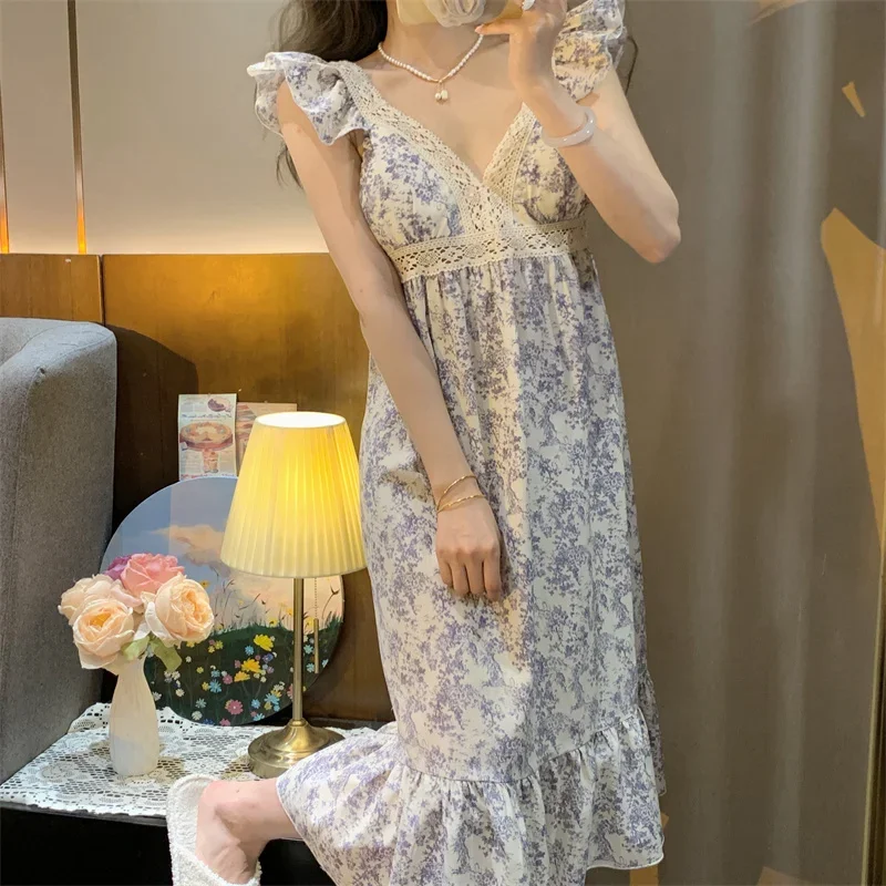 Lunivop Summer Nightgowns Women's Lace Halter Sweet Mid-Length Skirt V-Neck Nightgown with Chest Pad Shorts Summer Home Wear Sets