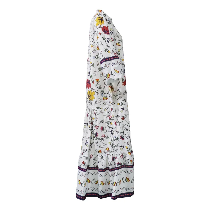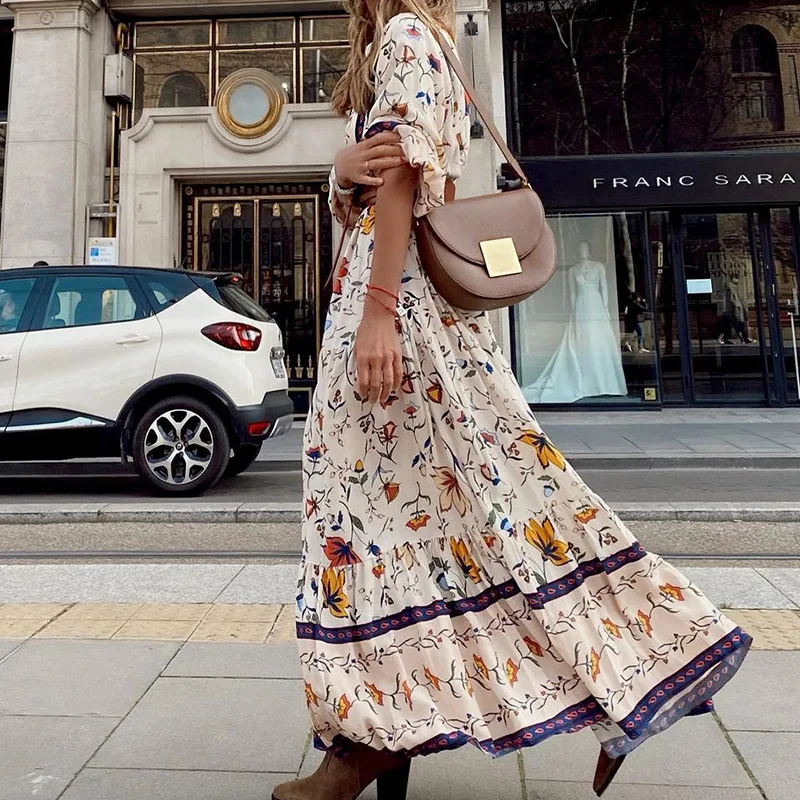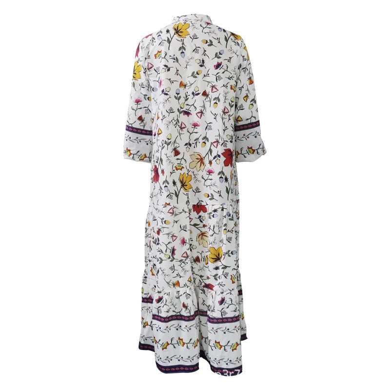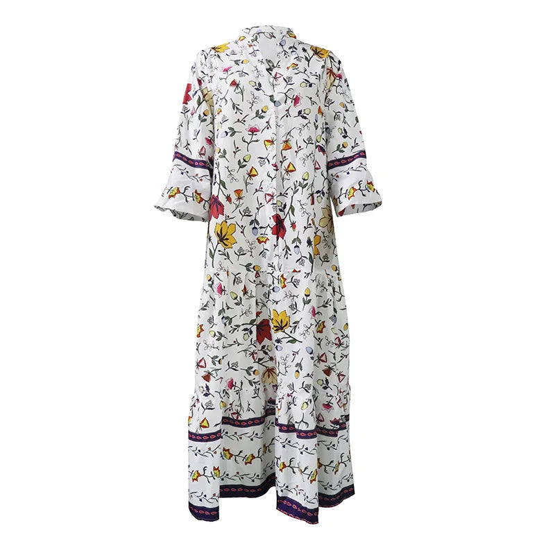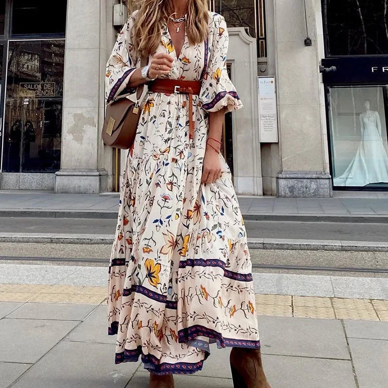 Lunivop Summer Printed Dress V-Neck Button Flare Sleeve Long Sleeve Long Dresses Bohemian Style Loose Sundress for Women