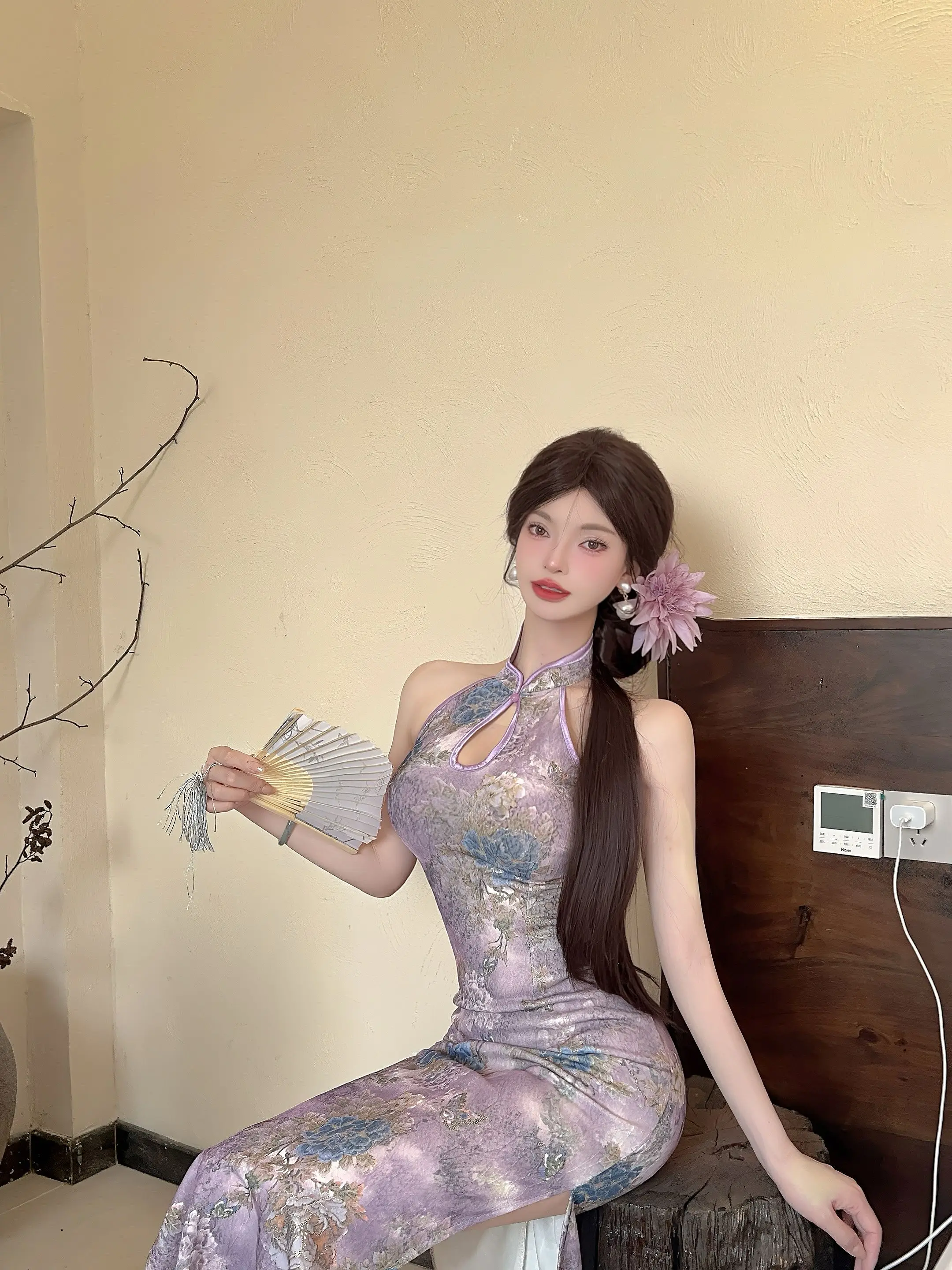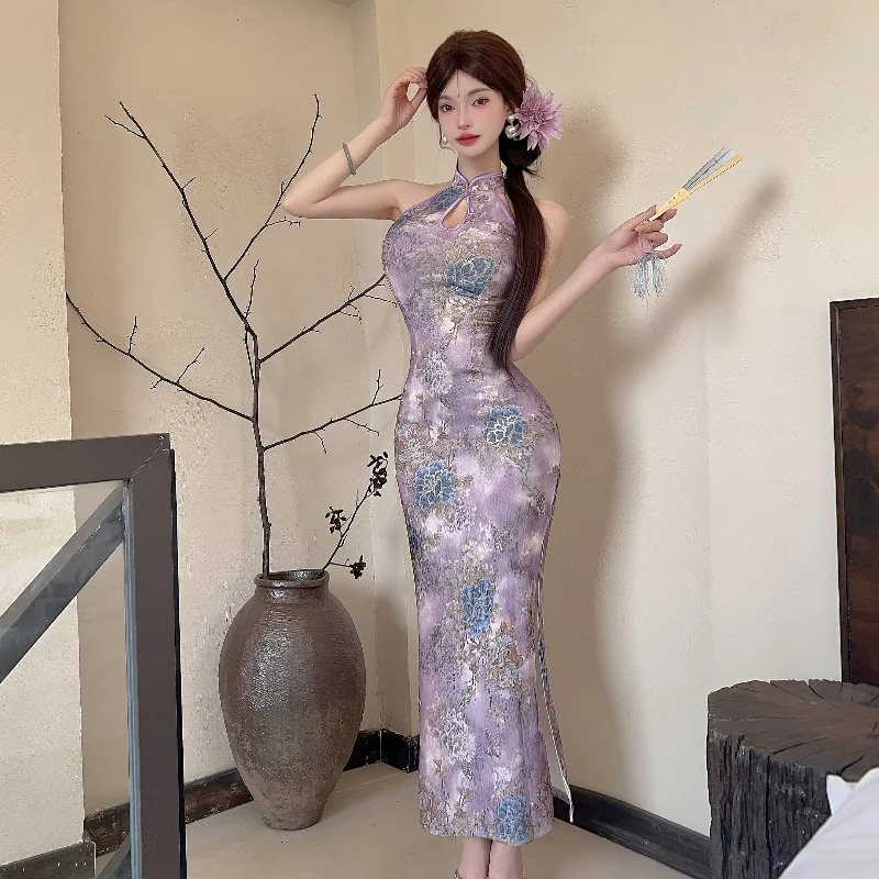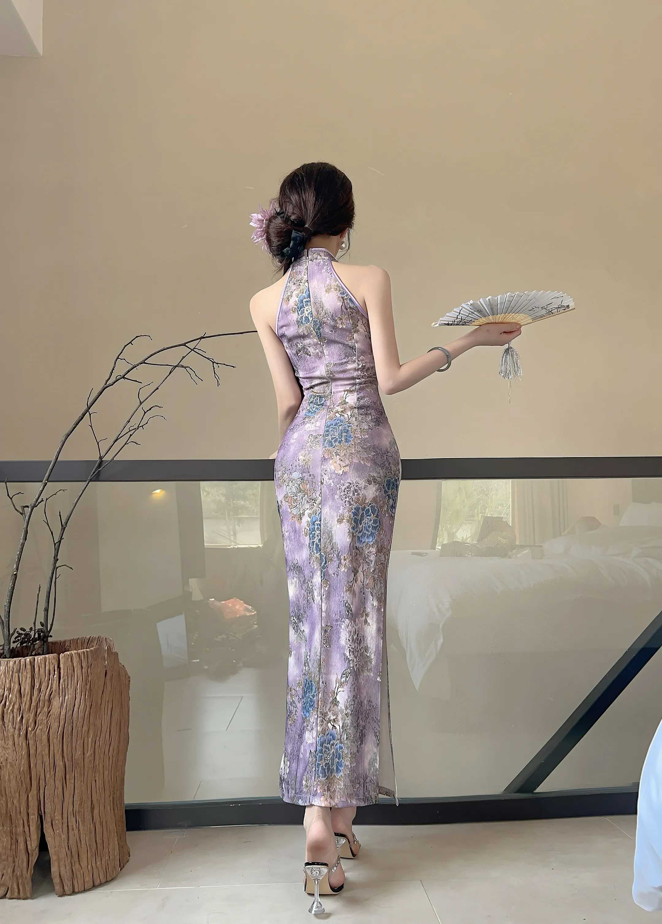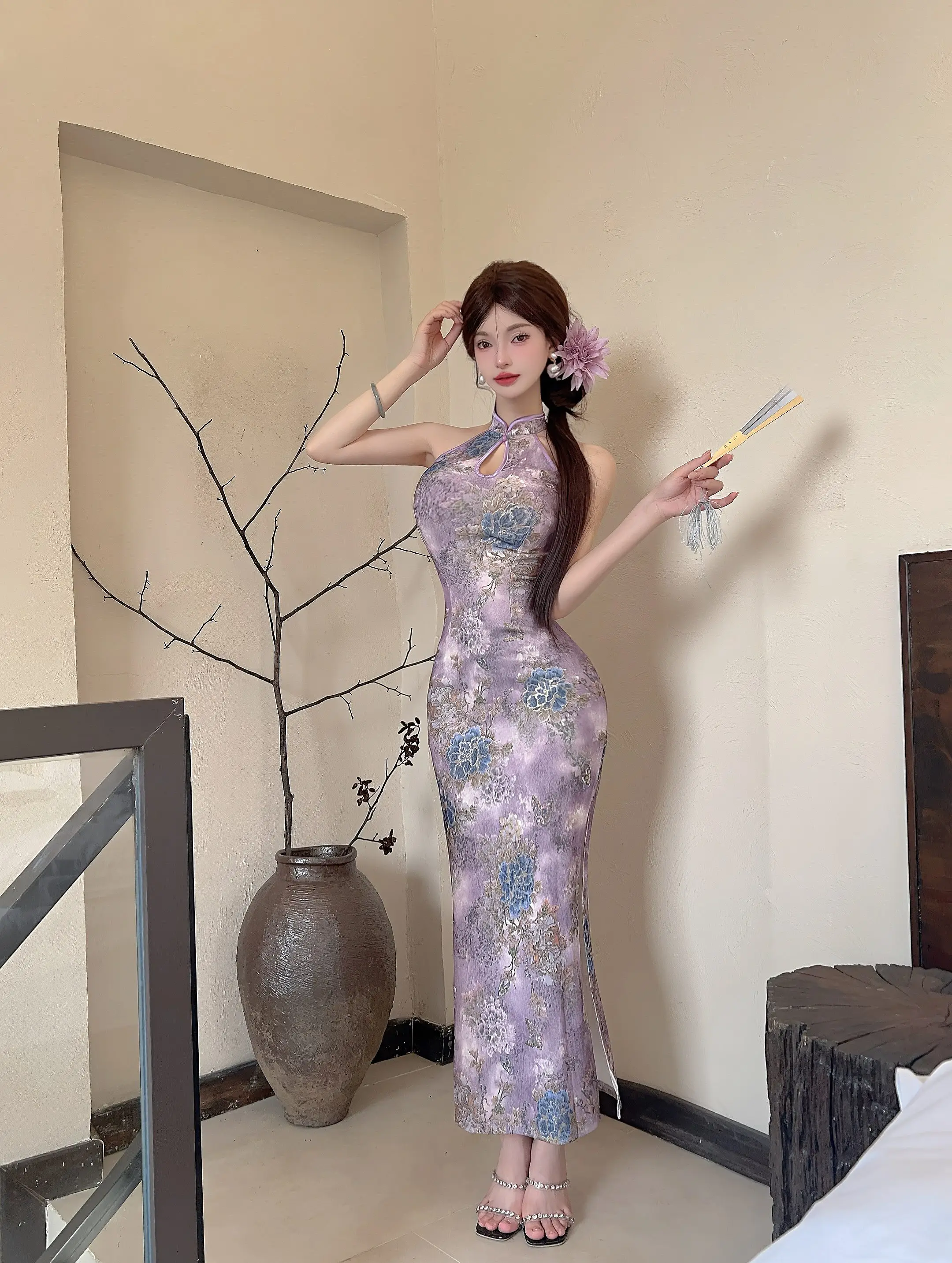 QAJAREL New Arrival High Quality Summer Purple Floral Stand Collar Cheongsam Dress Women Korean Luxury Elegant Dress Gown Vintage Bodycon Party Night Dress