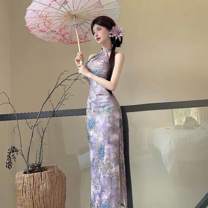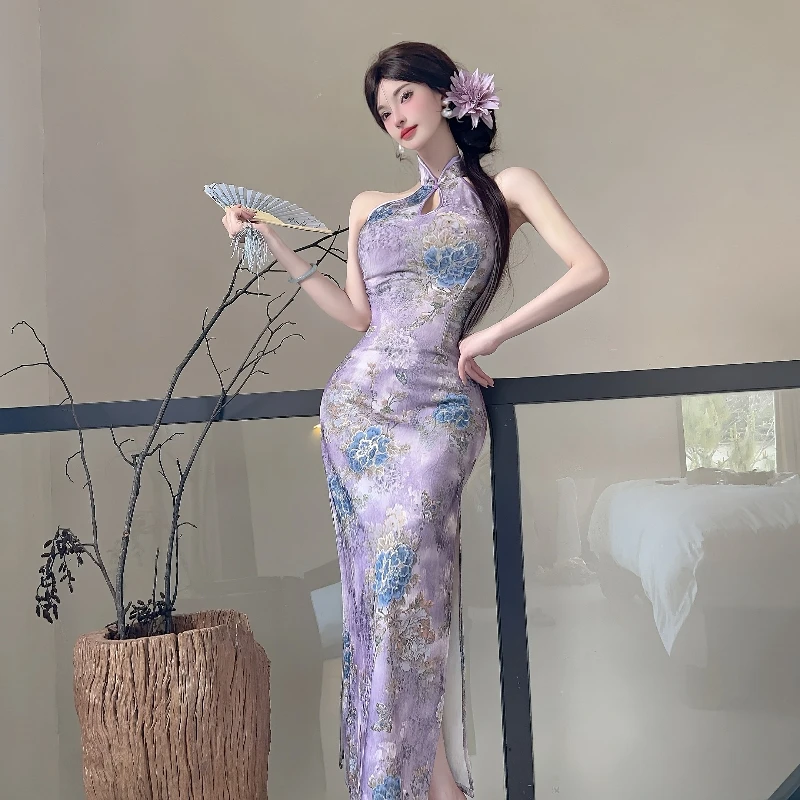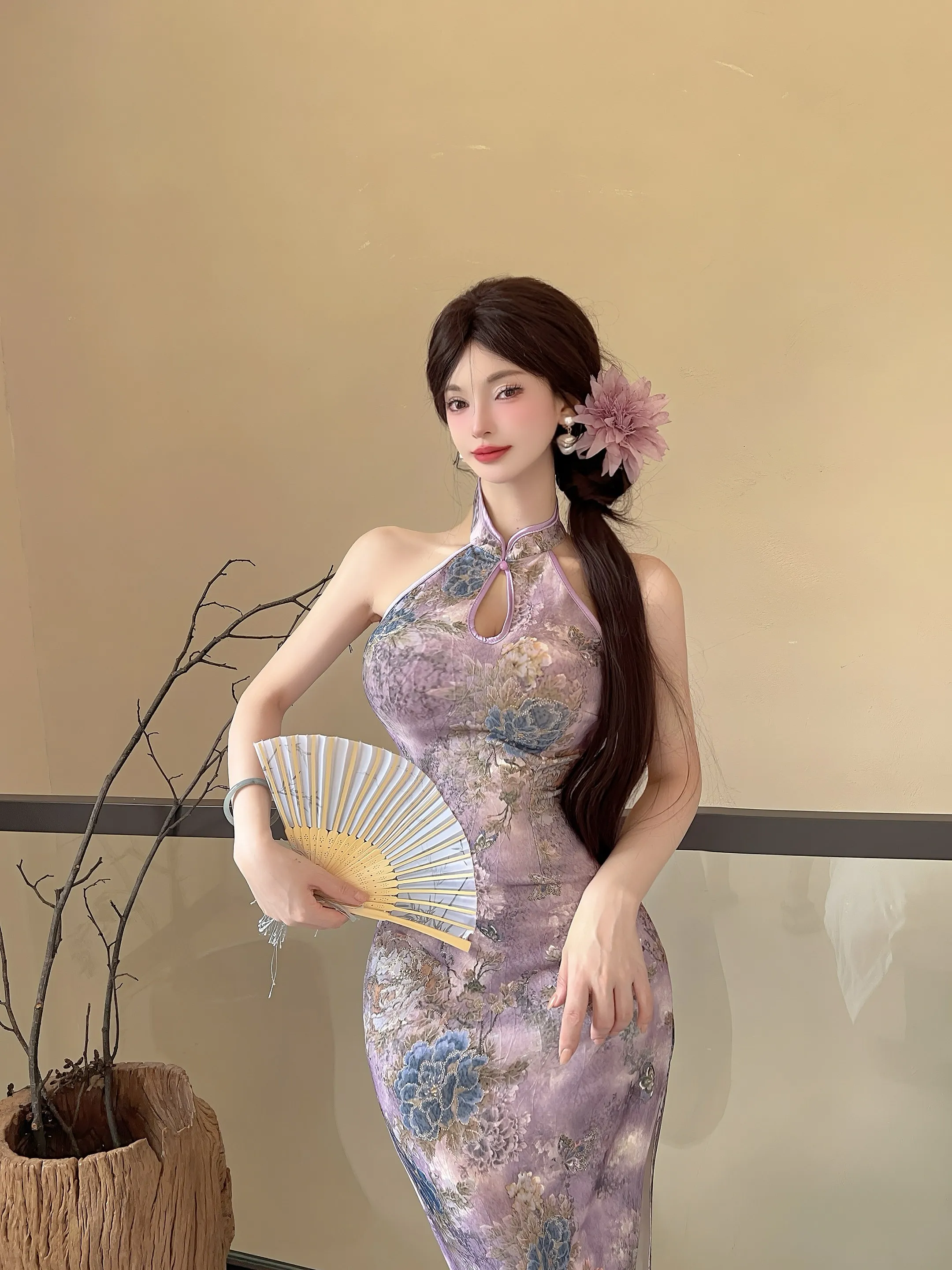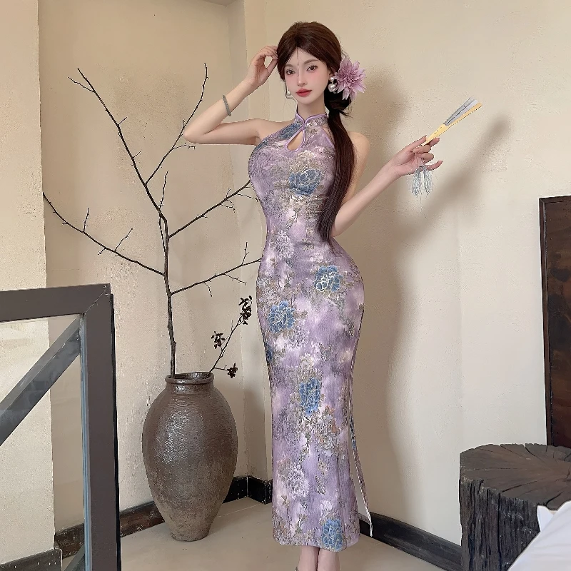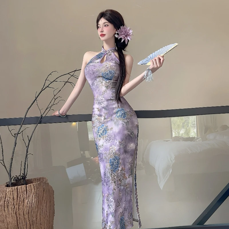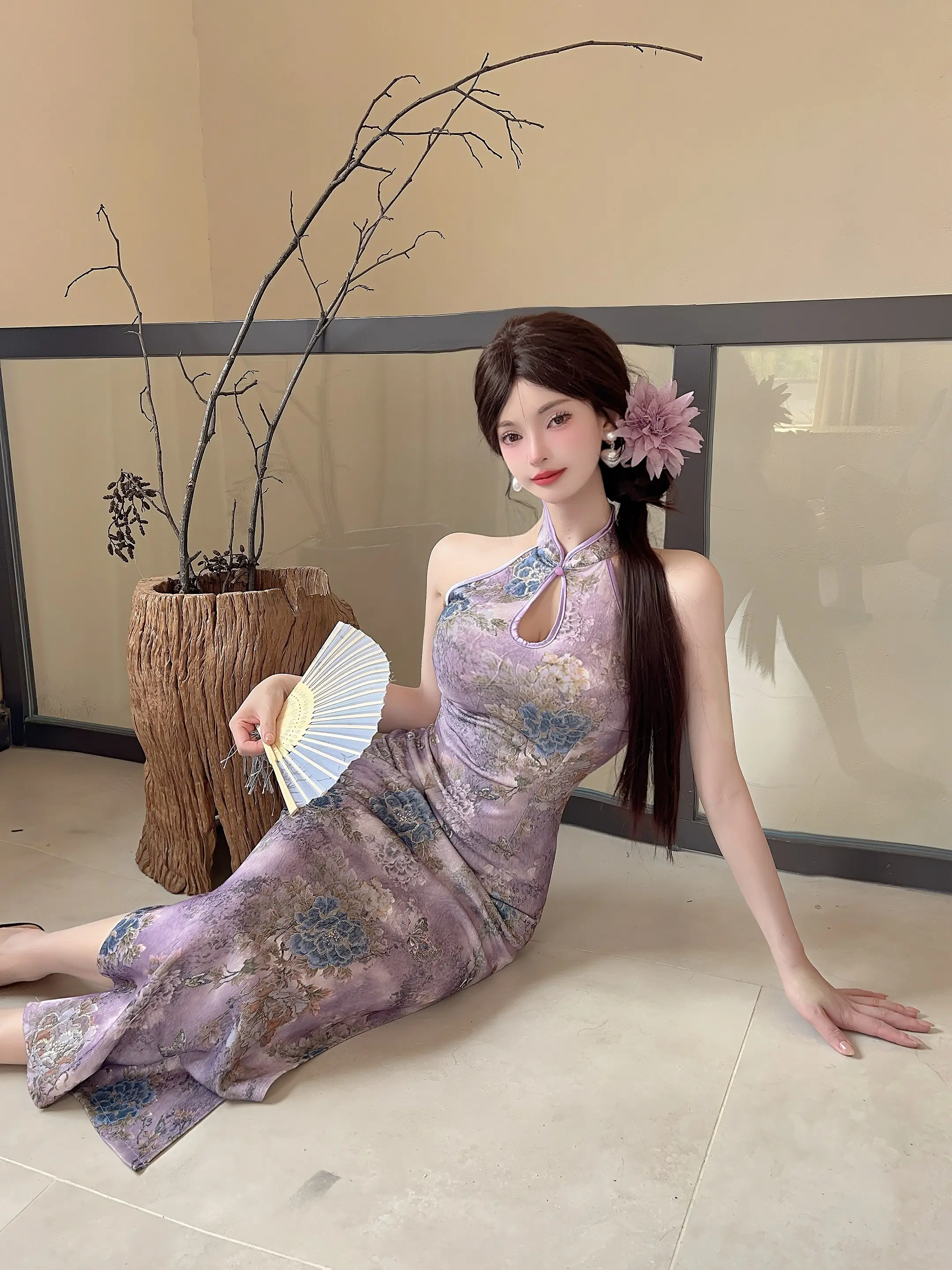 QAJAREL New Arrival High Quality Summer Purple Floral Stand Collar Cheongsam Dress Women Korean Luxury Elegant Dress Gown Vintage Bodycon Party Night Dress