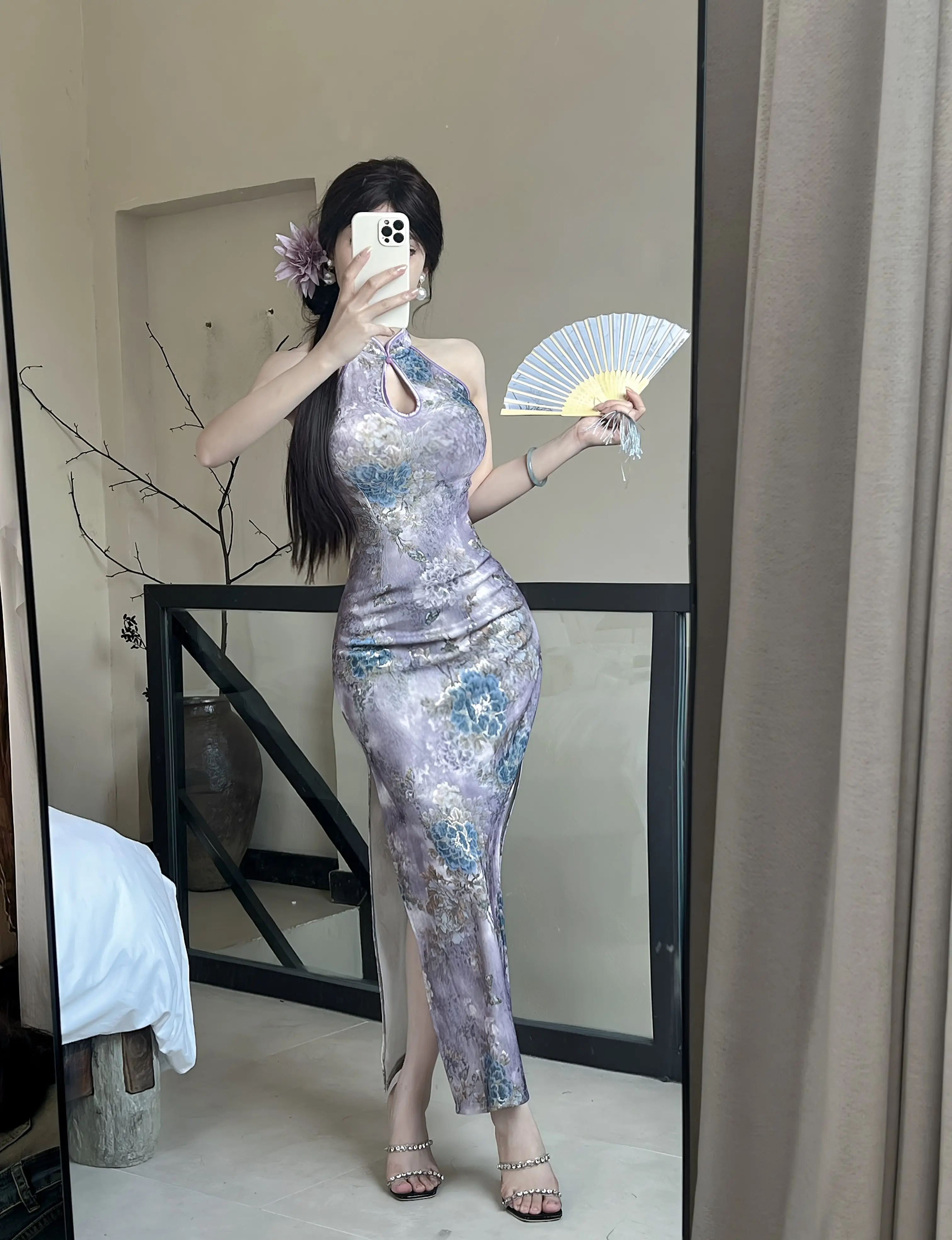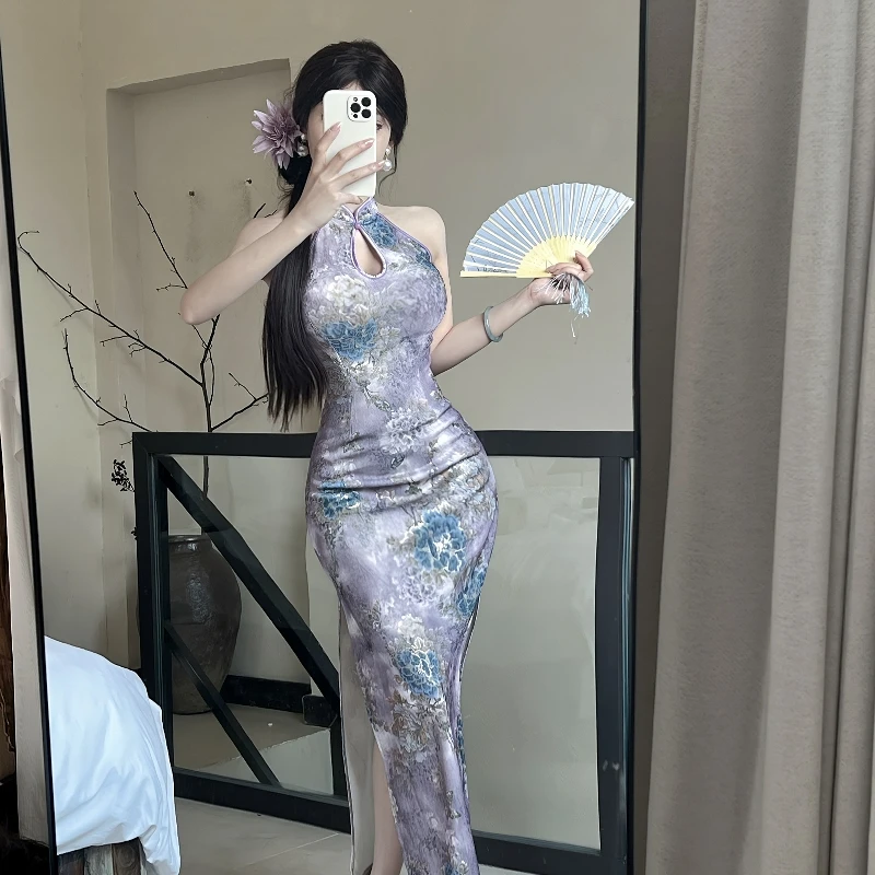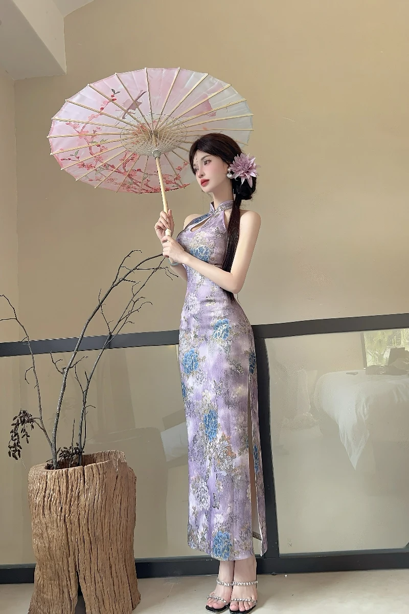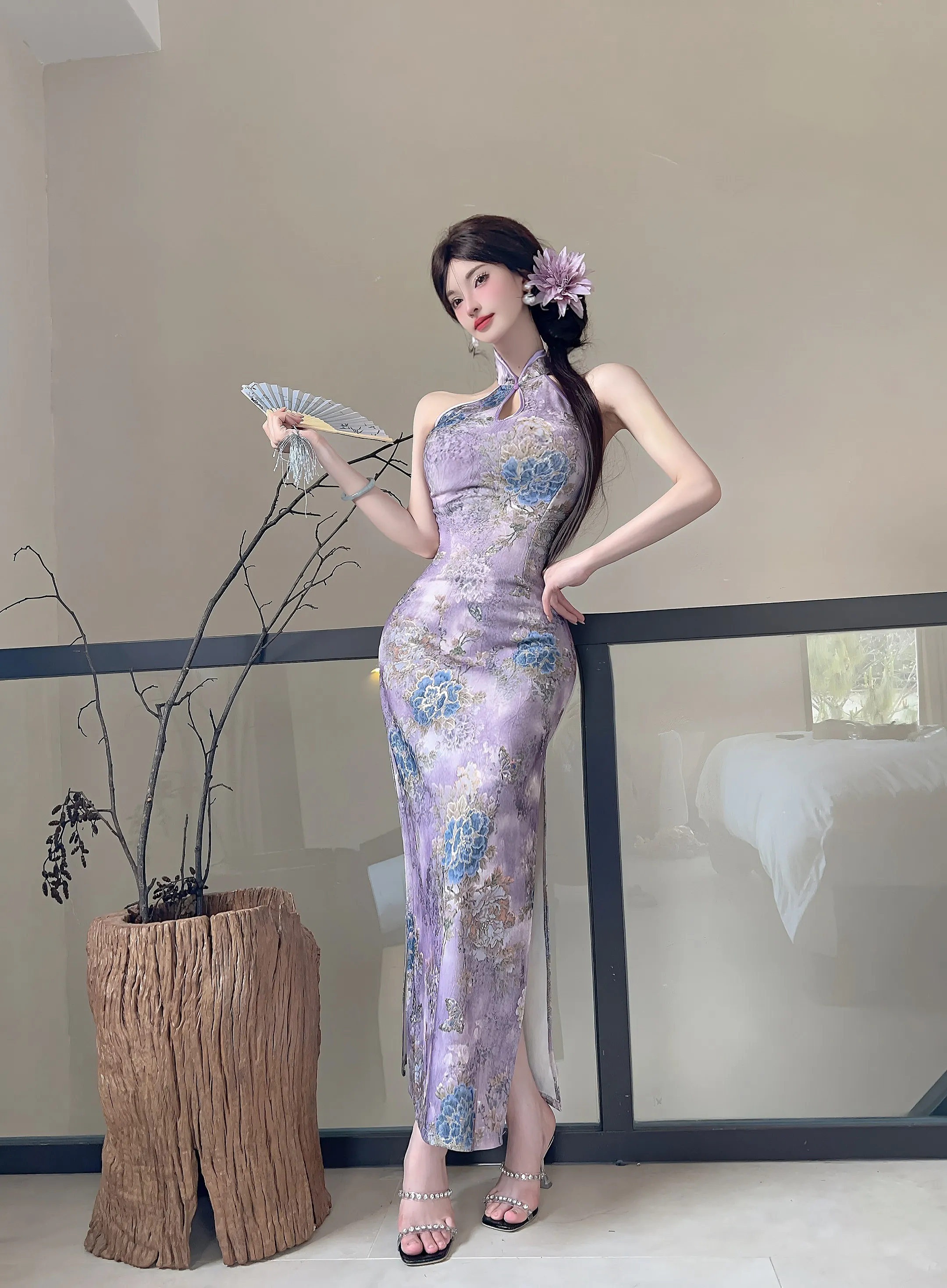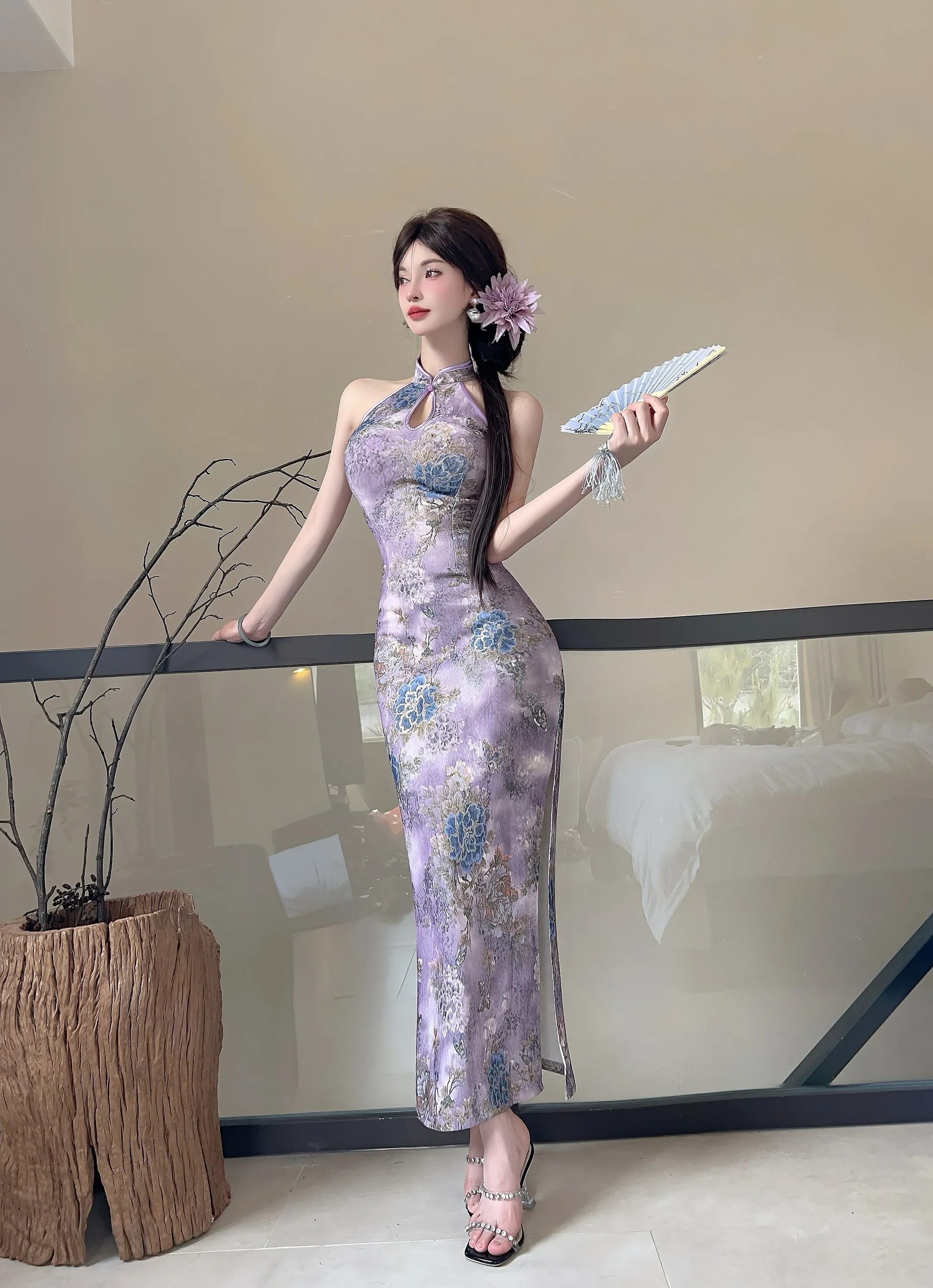 QAJAREL New Arrival High Quality Summer Purple Floral Stand Collar Cheongsam Dress Women Korean Luxury Elegant Dress Gown Vintage Bodycon Party Night Dress