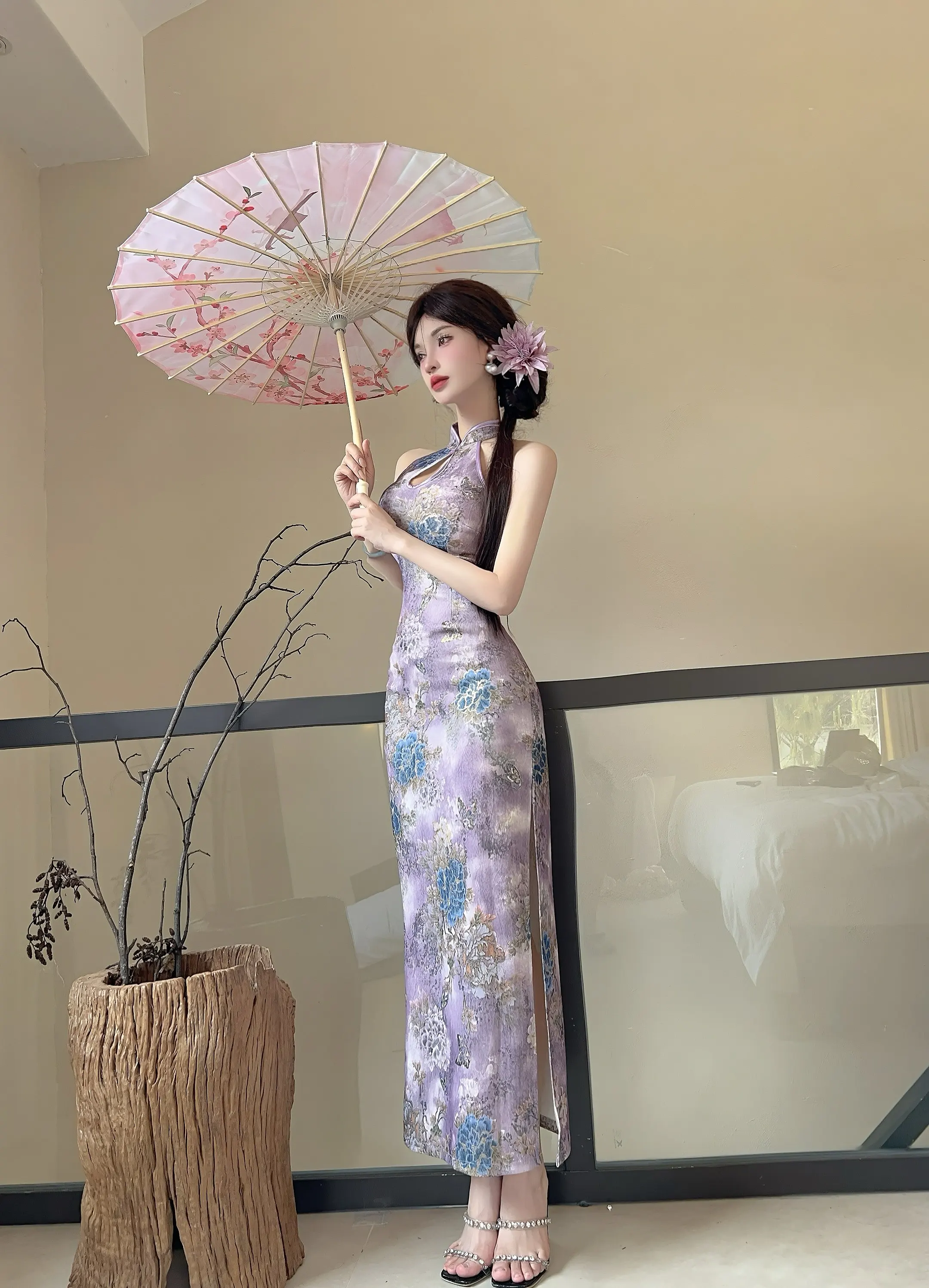 Lunivop Summer Purple Floral Stand Collar Cheongsam Dress Women Korean Luxury Elegant Dress Gown Vintage Bodycon Party Night Dress