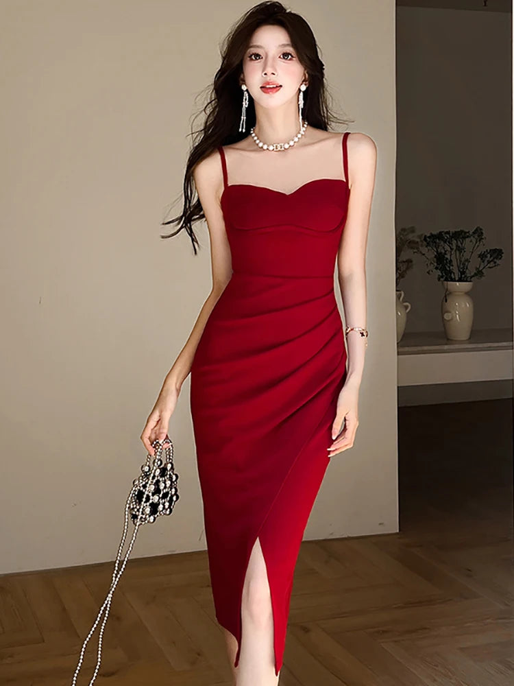QAJAREL New Arrival High Quality Summer Red Pleated Bodycon Hip Wrarp Sexy Sling Dress Women Korean Vintage Festival Dress Elegant Luxury Evening Dress