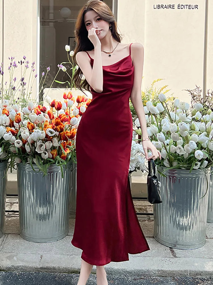 QAJAREL New Arrival High Quality Summer Red Satin Elegant Sling Long Dress Women Fashion Chic Diamonds Slit Dress Korean Vintage Luxury Party Evening Dress
