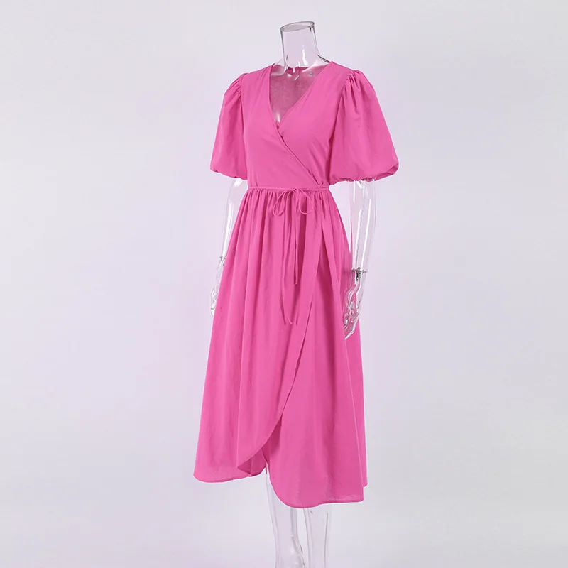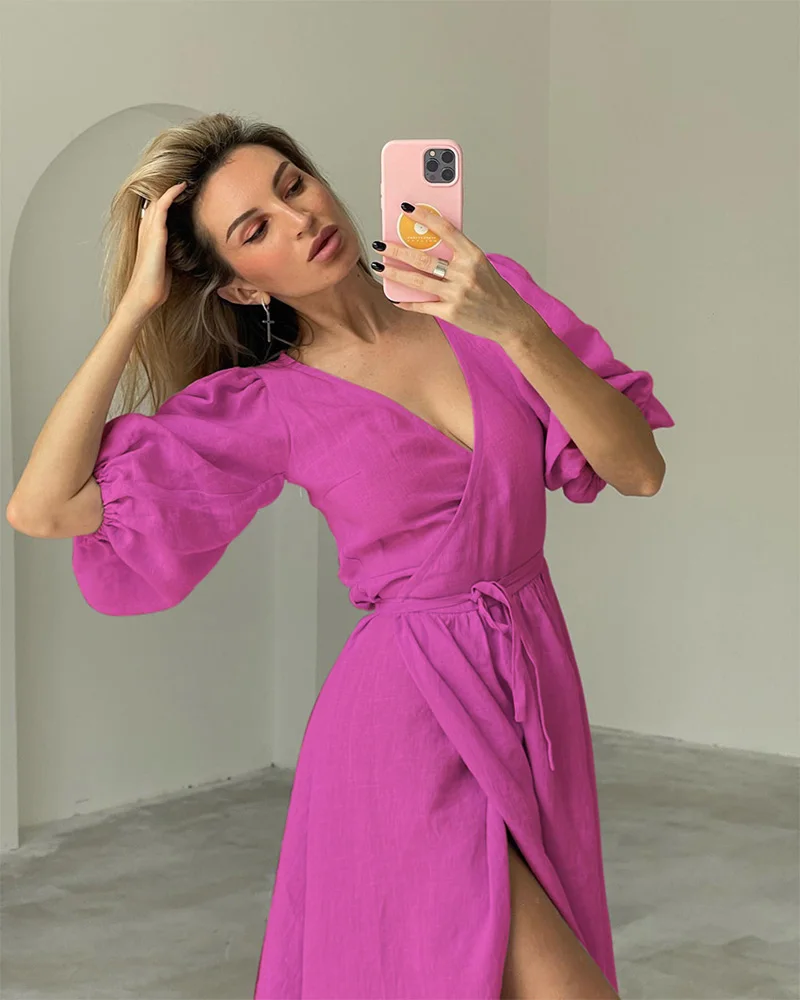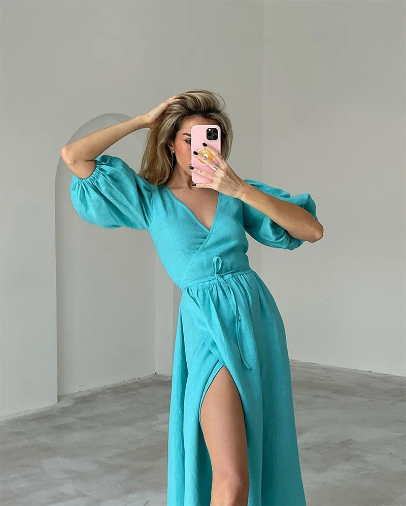 Lunivop Summer Spring Women Robe Midi Wrap Dress Lace Up V-neck Linen Solid Blue Short Sleeve Lantern Sleeve Flare Slit Dress