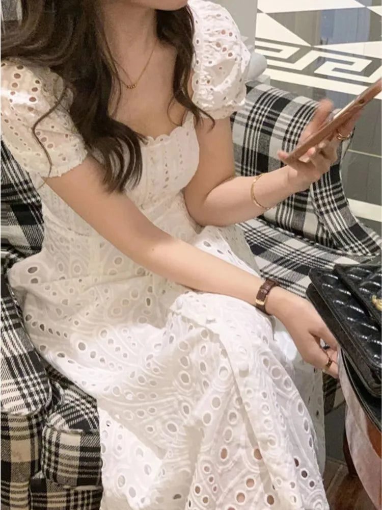 Summer White Midi Dress Hollow Out For Women Elegant Square Collar Puff Sleeve French Kawaii Vestidos Korean Chic Dresses Mujer