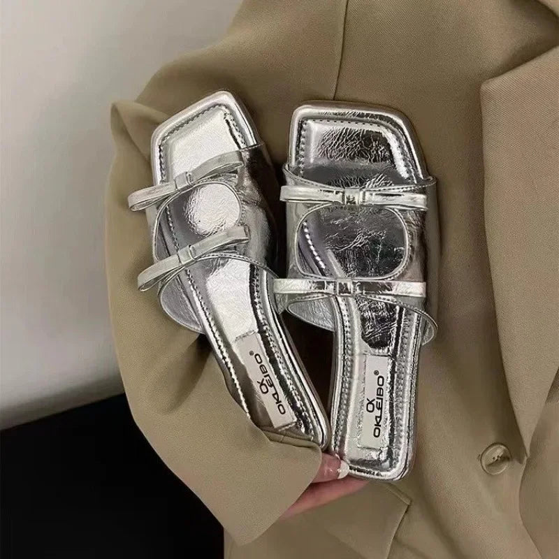 Lunivop Summer Woman Flat Slippers Square Toe Double Bowknot Sandals Casual Shoes Ladies Soft Sole Beach Slippers Women Shoes