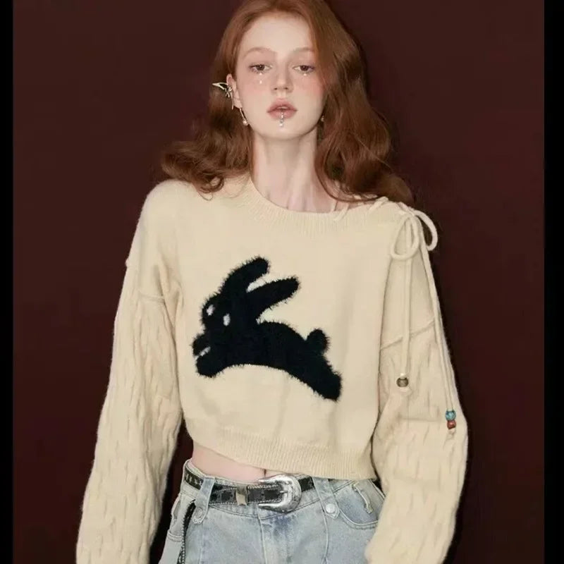 Lunivop Sweet Bandage Off Shoulder Sueter Mujer Loose Knitted Short Y2k High Waist Cartoon Rabbit Print Women Crop Tops Sweaters
