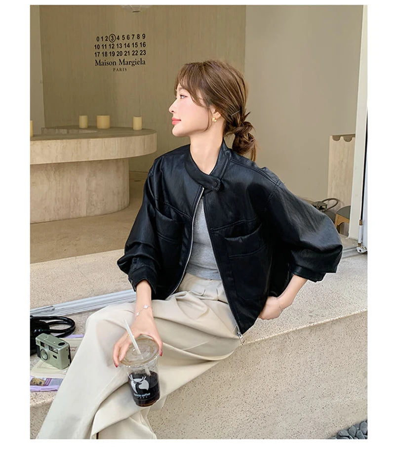 Lunivop Sweet Biker Pu Jacket Women Vintage Preppy Style Big Pockets Short Coat Casual Korean Long Sleeve Retro O Neck Cute Tops