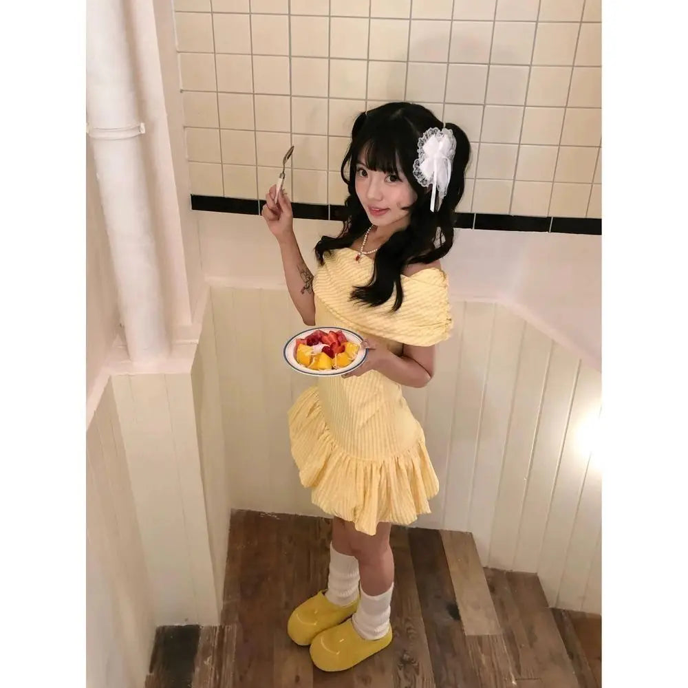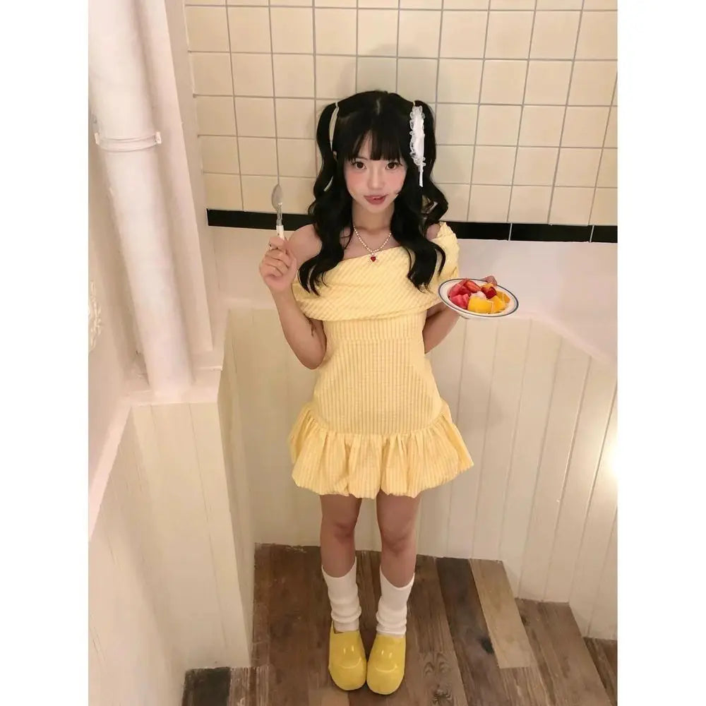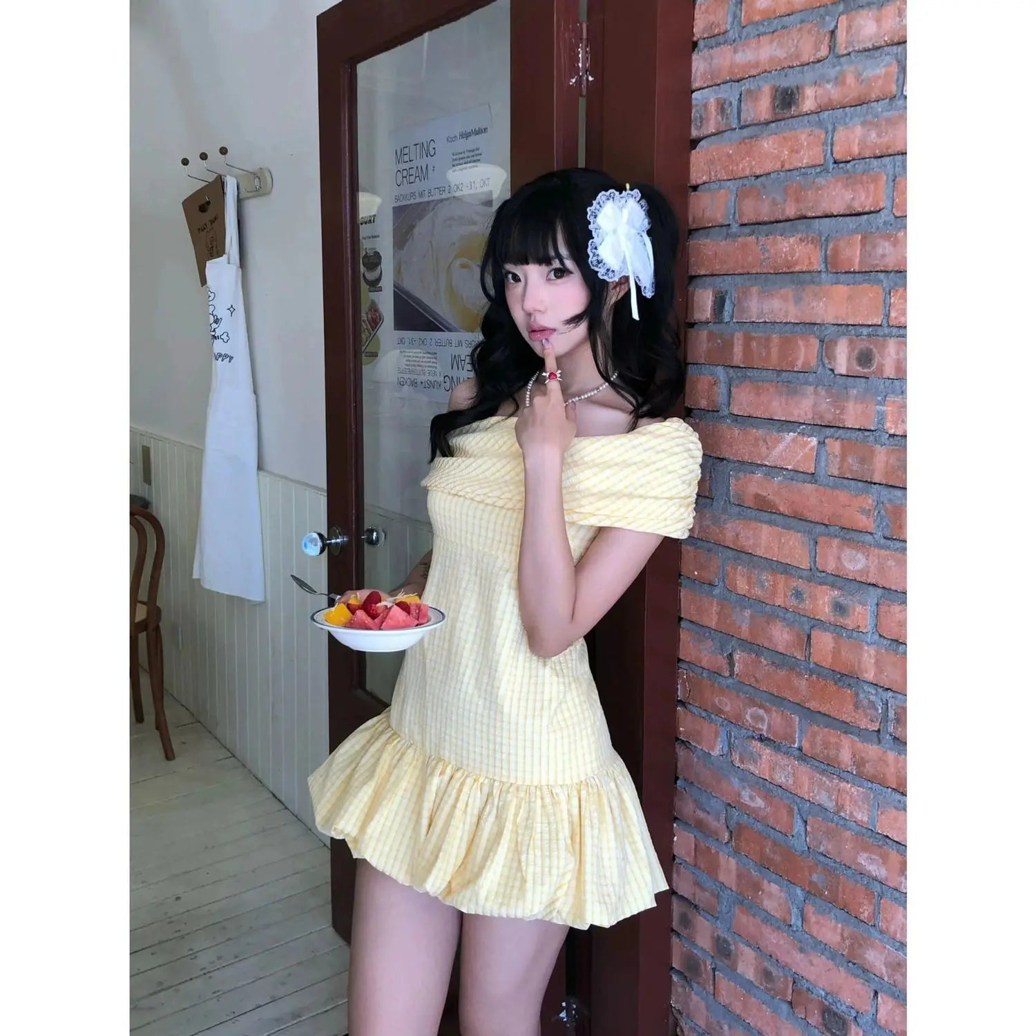 Lunivop Sweet Elegant Bodycon Mini Dresses Women Off Shoulder Korean Style Butter Yellow Plaid Ruffles Dresses Y2k Harajuku