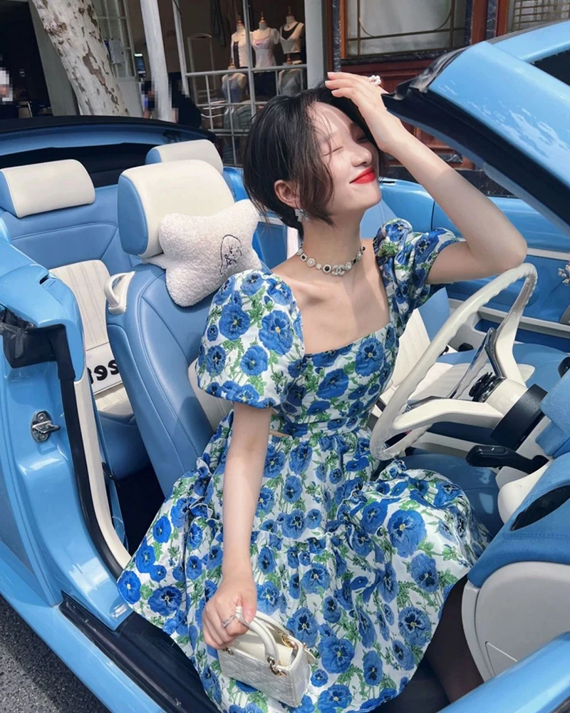 Lunivop Sweet Floral Dress Women Print Hollow Out Bandage Bow A Line Mini Dresses Korean Vintage Square Neck Puff Sleeve Vestidos