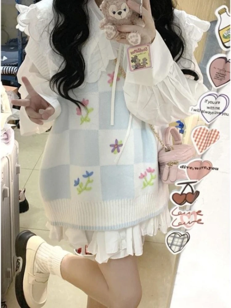Lunivop Sweet Fresh Flower Embroidery Sweater Vest Spring New Mid-length Loose Tank Top Y2k Grunge Sleeveless Knitted Tops Women