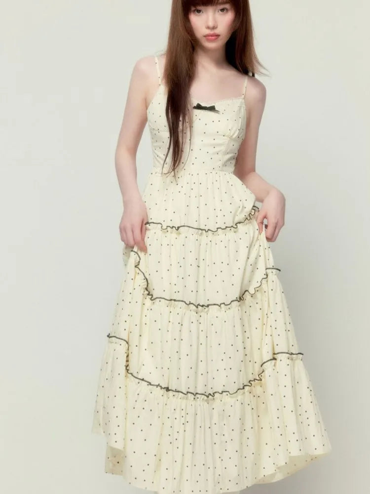 Lunivop Sweet Gentle Style Polka Dot Print Long Camisols Cake Dresses Women's Summer Spliced Lace V-neck Sleeveless Bow Suspender Dress
