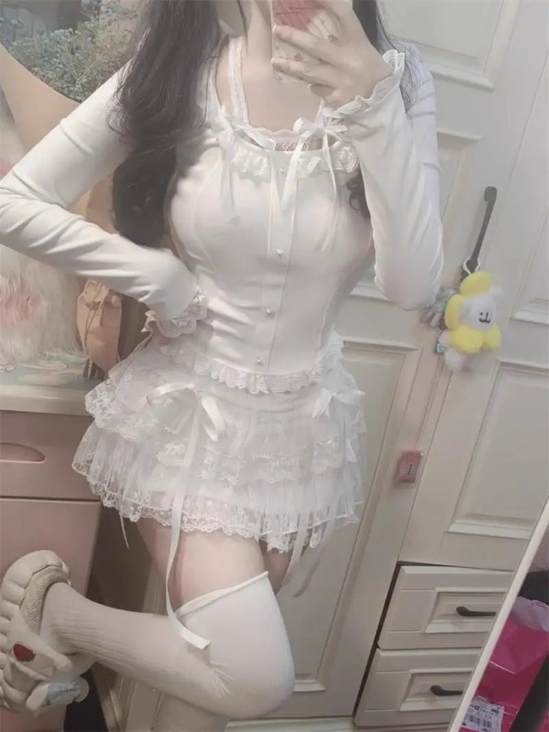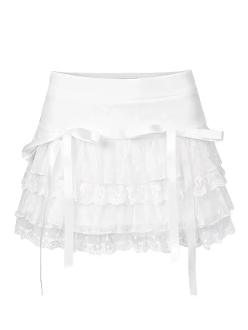 Lunivop Sweet Kawaii Skirts Women Lolita Coquette Lace Bow Patchwork Mini Skirt White High Waist Cute Summer A-line Short Skirt