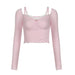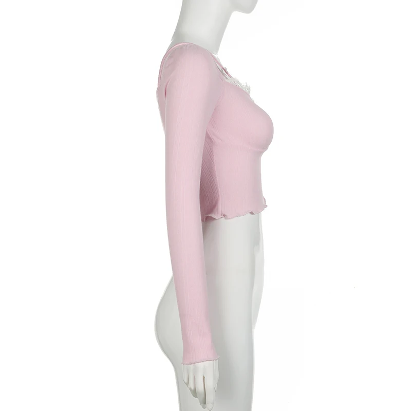 Lunivop Sweet Off-shoulder Cute Crop Top Lace Patchwork Pink Coquette Aesthetic Slim-fit Long Sleeve Knitted T-shirts Ladies y2k