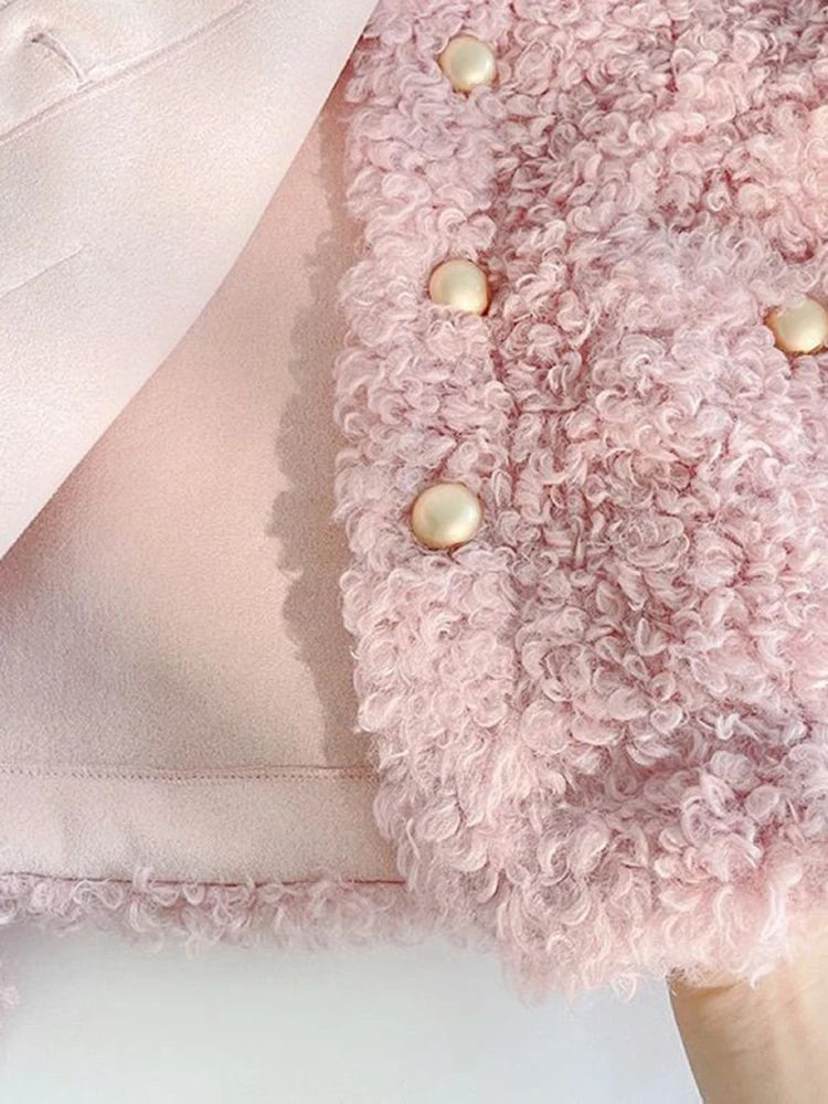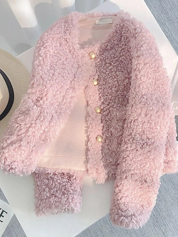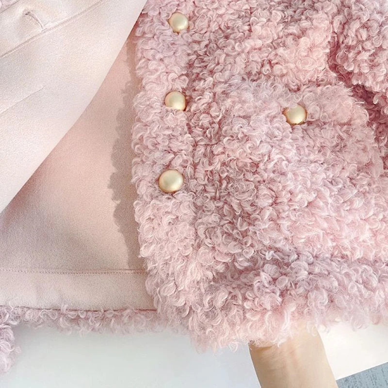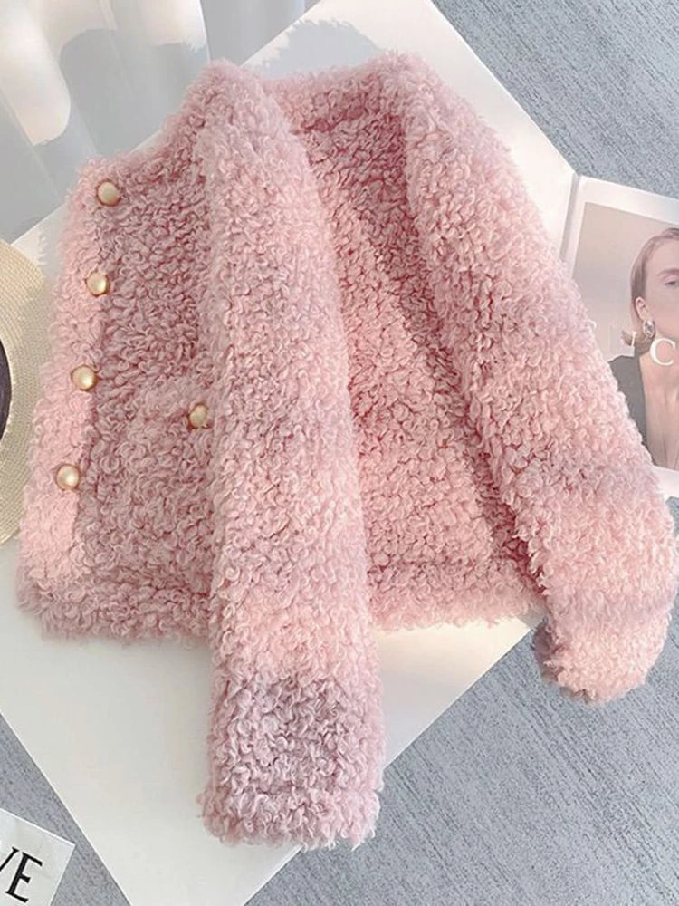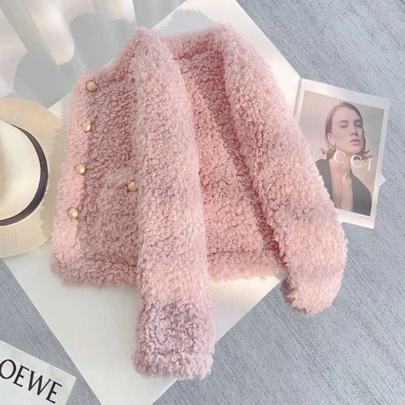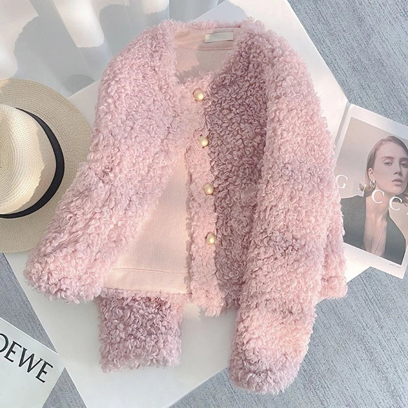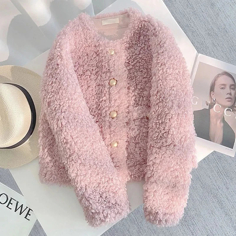 Lunivop Sweet Pink Faux Lamb Coat Women Cute Slim Long Sleeve Vintage Jacket Winter Warm O Neck Elegant Korean Female Casual Tops