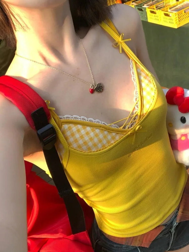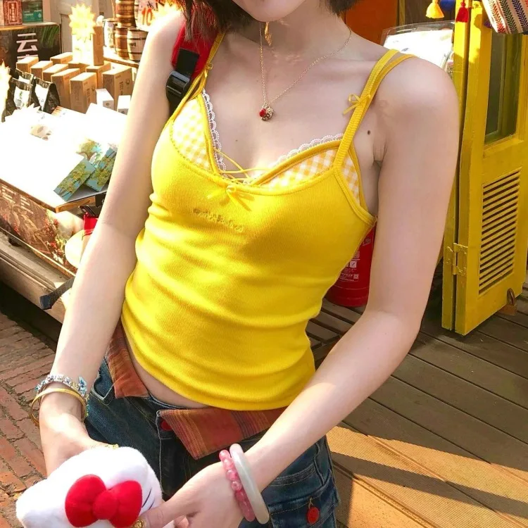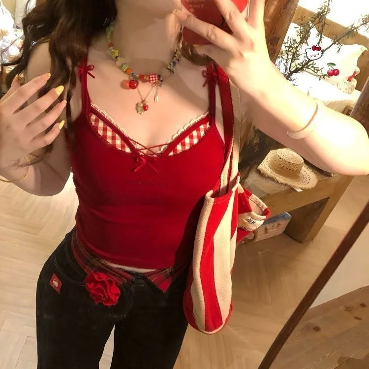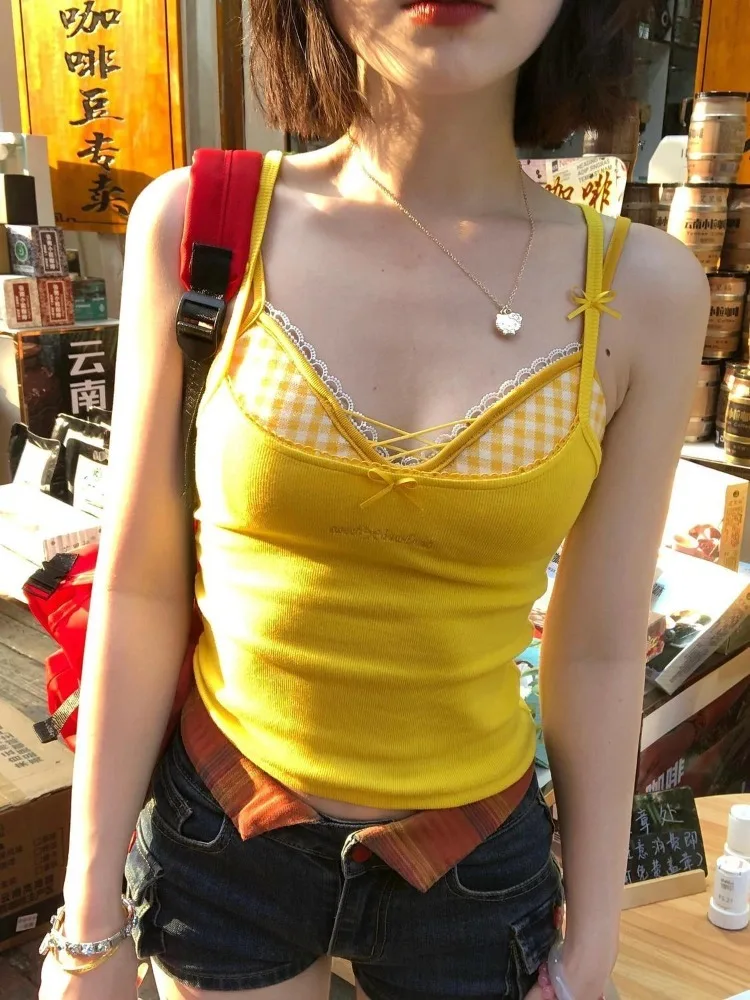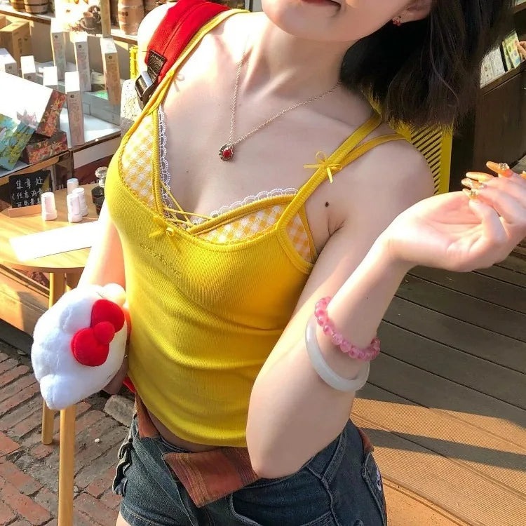 Lunivop Sweet Plaid Patchwork Cross Camisole Vest 2025 Summer New All-match Tank Top Fashion Sexy Slim Fit Sleeveless Top for Women