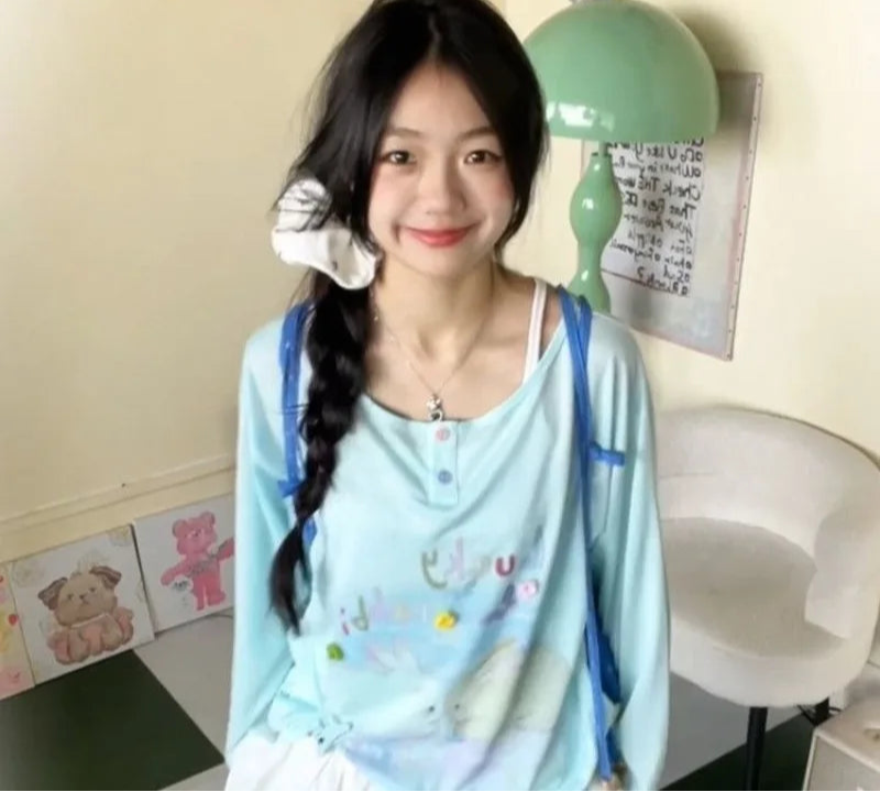Lunivop T Shirts Women Cartoon Printed Long Sleeve Sweet Summer Fashion Loose Tops Preppy Style Female Casual Tshirt Chic