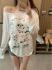 Lunivop T Shirts Women Funny Cartoon Printed Long Sleeve Diagonal Collar Off Shoulder Loose Sweet Tops Female Casual Y2k Tshirt
